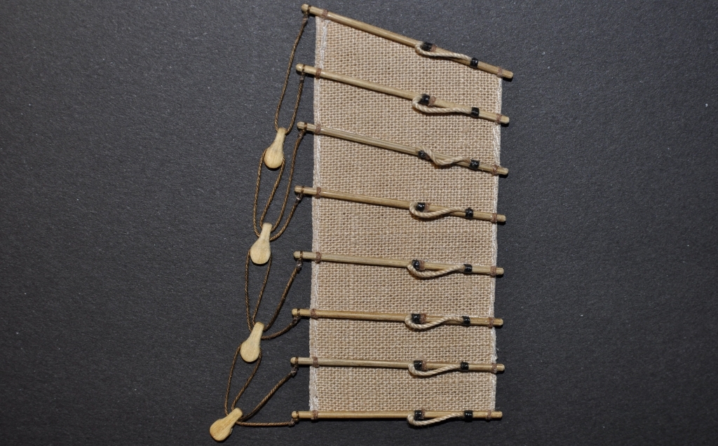 Do wiązania bloczków wykorzystałem nić bawełnianą (została zafarbowana w bejcy). Nić dowiązałem do usztywnień żagla – sposób wiązania i rozmieszczenie bloczków jest widoczny na zdjęciu. Węzły na bambusowych patyczkach mają możliwość swobodnego obracania się w celu łatwego układania lin i bloczków (na zakończeniach patyczków w miejscu wiązania lin wykonałem trójkątnym pilnikiem rowki, które zabezpieczają nić przed zsuwaniem się z patyczków a zarazem umożliwiają swobodne obracanie się pętelki).