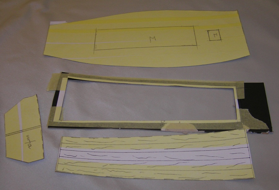 Przy pomocy żelazka nakleiłem ją na czarny karton. Dodatkowo od spodu (na karton)doszła taśma malarska. Wyrysowałem ołówkiem deski szerokości 10mm oraz poprzeczne linie gdzie będą łączenia( nacięcia) desek.