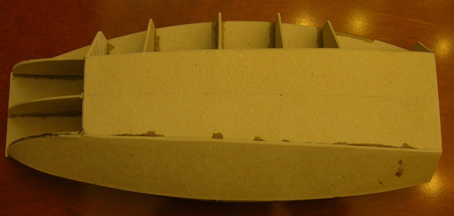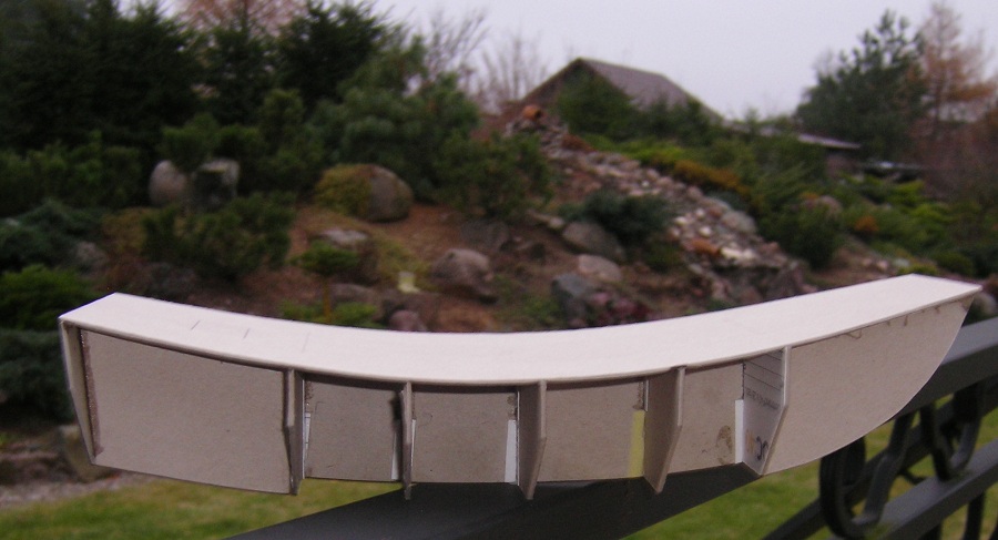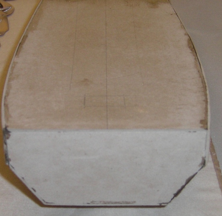 Plany pobrane z KOGI, wydrukowane na papierze formatu A3. (To był przypadek że nie na A4 – nie zwróciłem wcześniej na to uwagi). Już po wycięciu wręg , zorientowałem się, że wymiary w planach ( np. masztu)nie pokrywają się z wymiarami na arkuszu, ale uznałem że może być trochę większy. Szkielet - karton szary 2mm, poszycie karton ok 1,5 mm – pudełko po butach. Elementy szkieletu przyklejam taśmą malarską do kartonu ( odpada problem zabawy z klejem i późniejszymi konsekwencjami jego stosowania). Po nacięciu po liniach obrysu środek szablonu sam odpada. Potem 3-4 razy po wyznaczonym „torze” zarysu i gotowy „suchy” element.