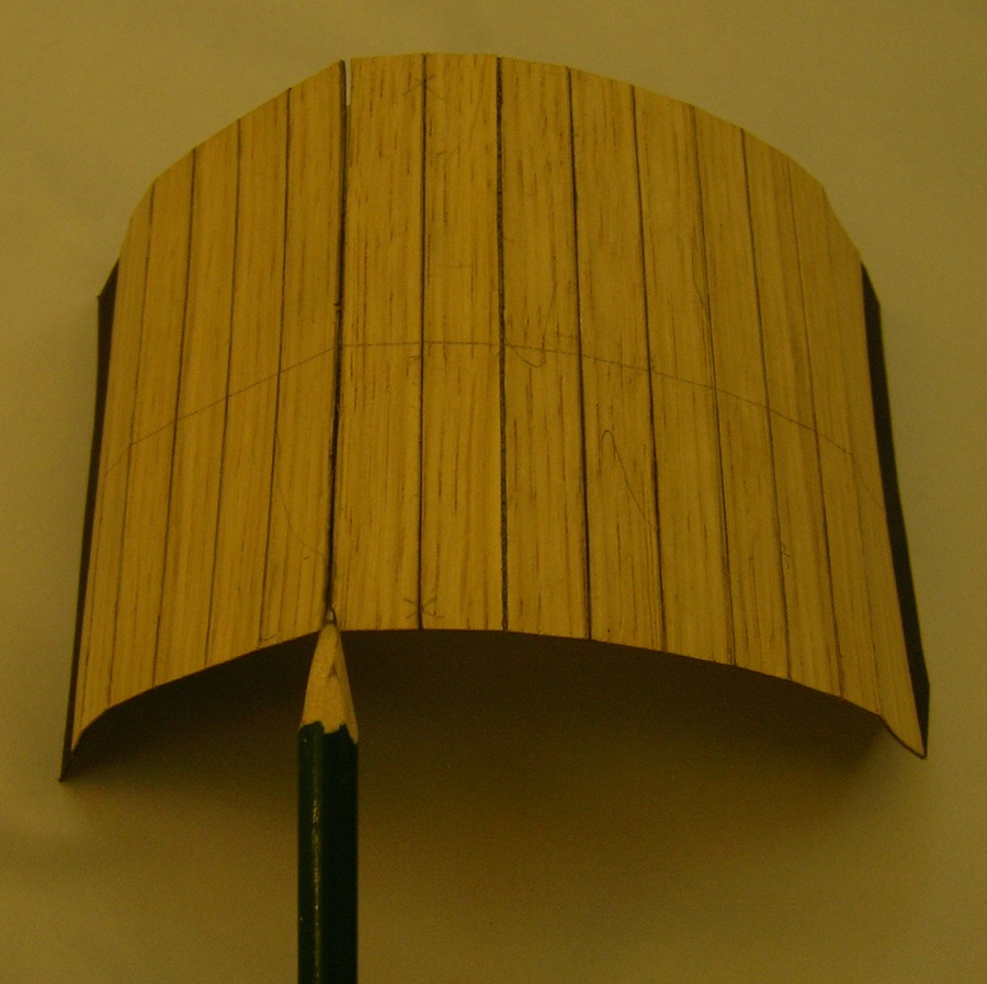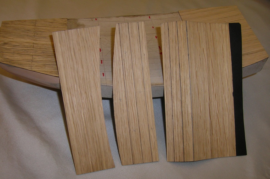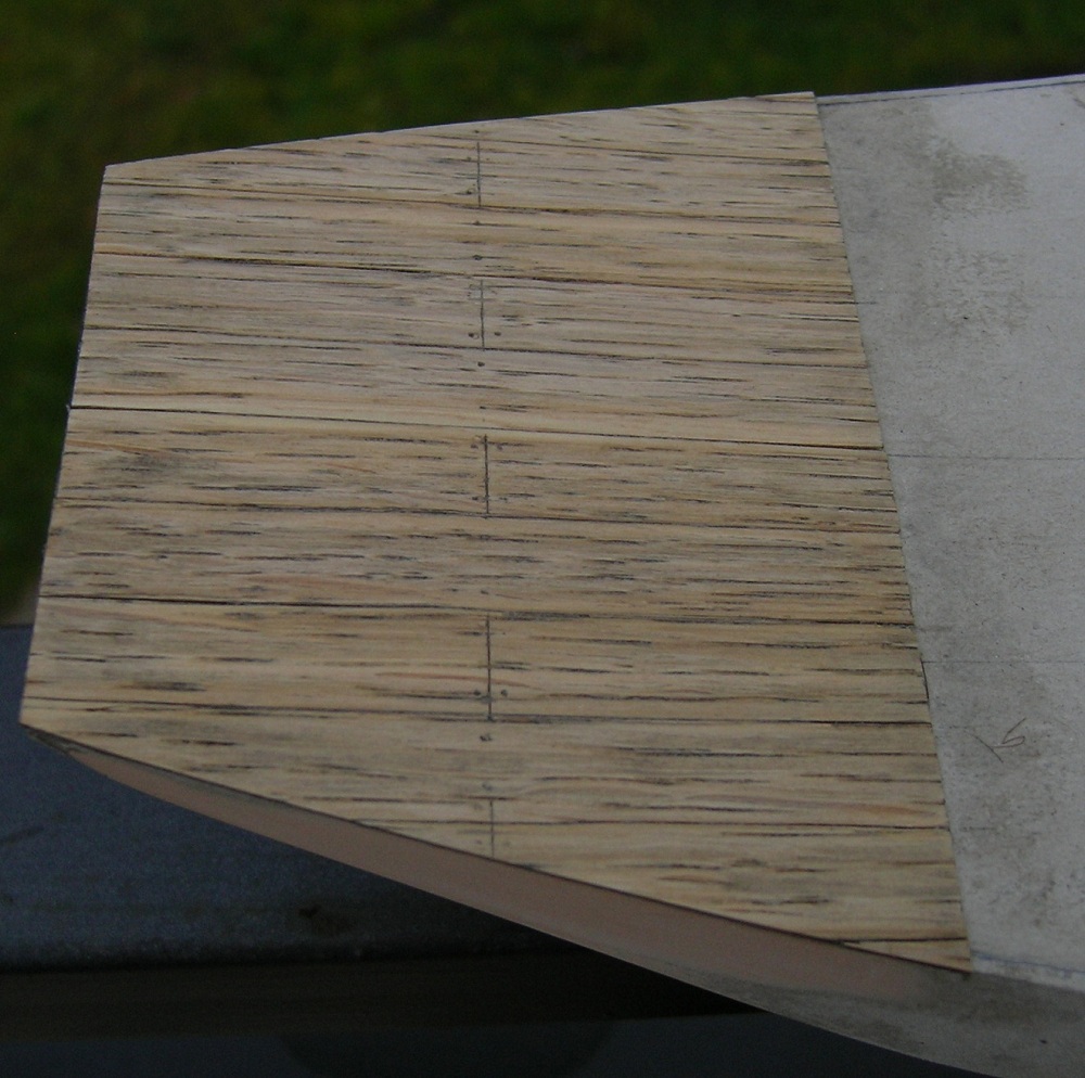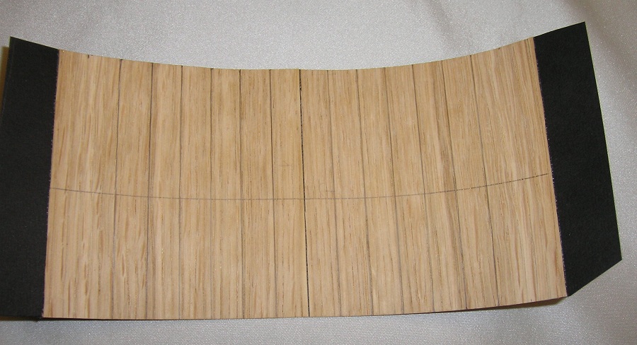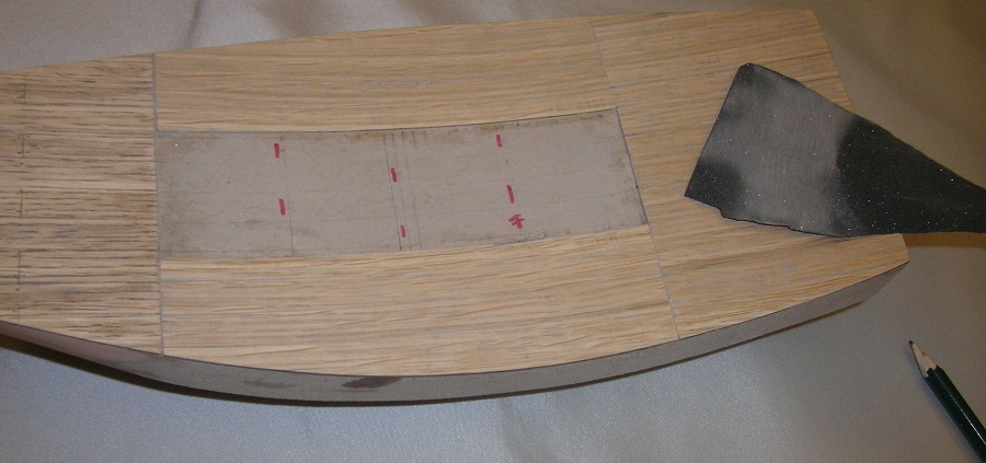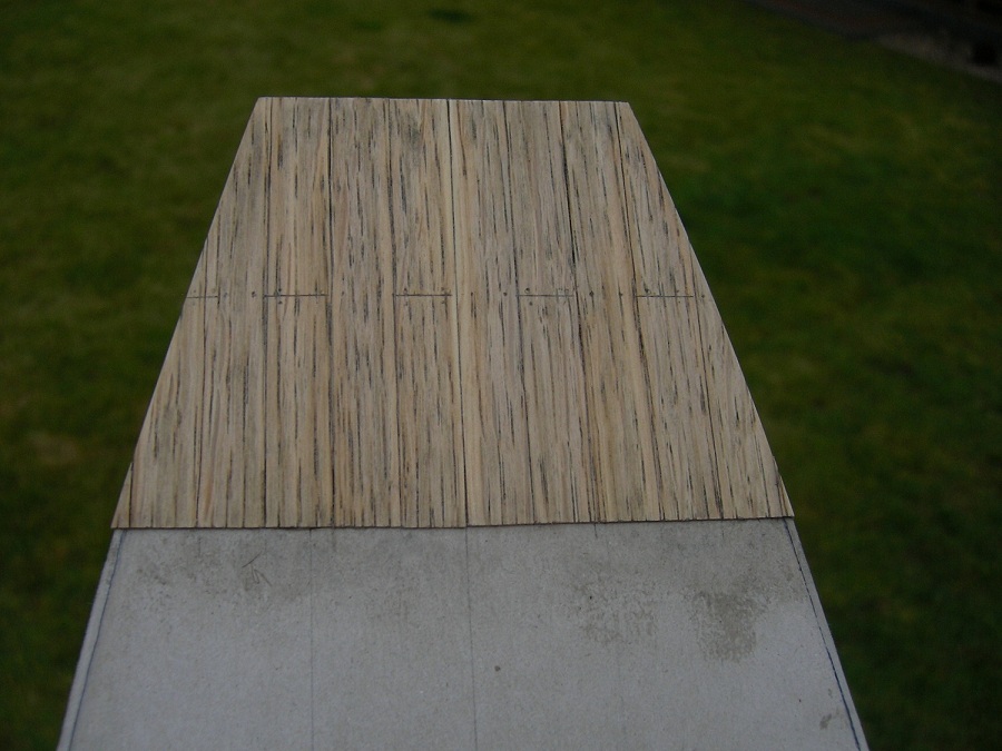 Po przyłożeniu i obrysowaniu od kadłuba wyciąłem gotowy segment . Poprzecznie okleinę dębowa bardzo źle się tnie nożykiem, natomiast bez problemu nożyczkami. Gotowy segment przykleiłem klejem Pattex expres. Całość przeszlifowałem gruboziarnistym papierem , deski porysowałem miękkim ołówkiem, całość przetarłem papierem 800, „rozprowadzając” grafit, pokryłem Caponem