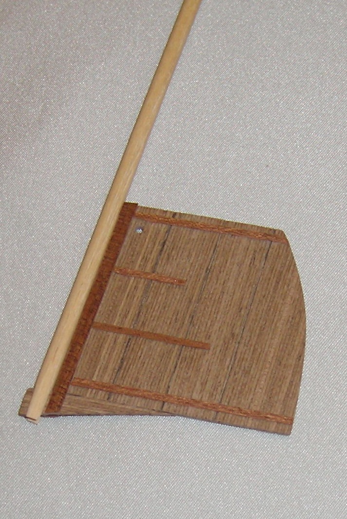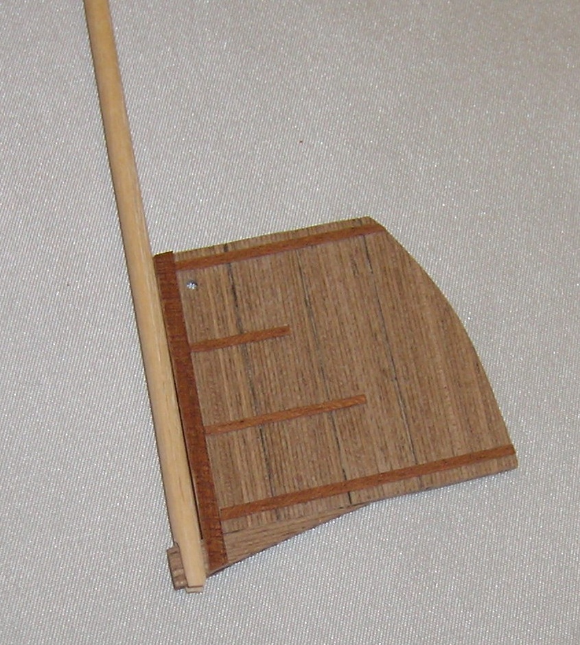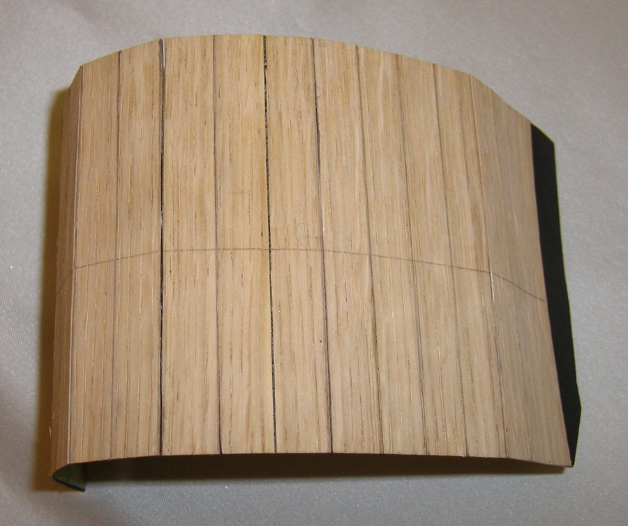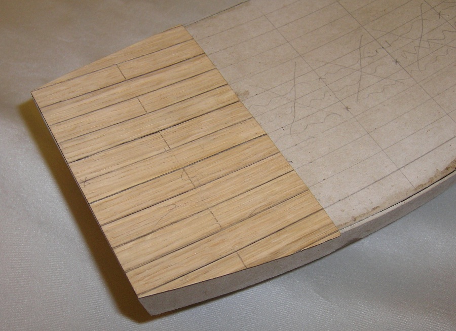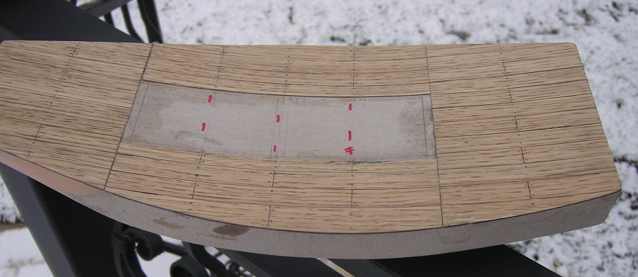 Po przyłożeniu i obrysowaniu od kadłuba wyciąłem gotowy segment . Poprzecznie okleinę dębowa bardzo źle się tnie nożykiem, natomiast bez problemu nożyczkami. Gotowy segment przykleiłem klejem Pattex expres. Całość przeszlifowałem gruboziarnistym papierem , deski porysowałem miękkim ołówkiem, całość przetarłem papierem 800, „rozprowadzając” grafit, pokryłem Caponem