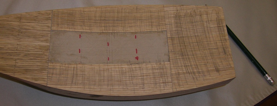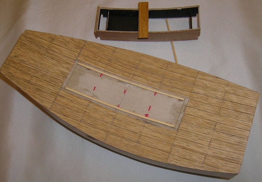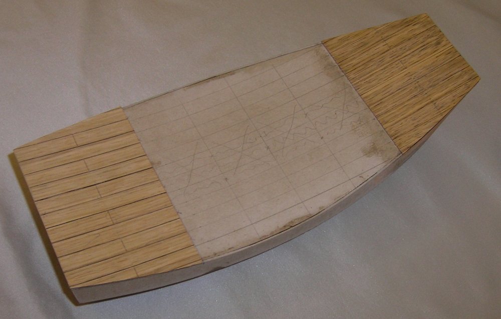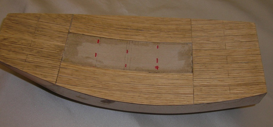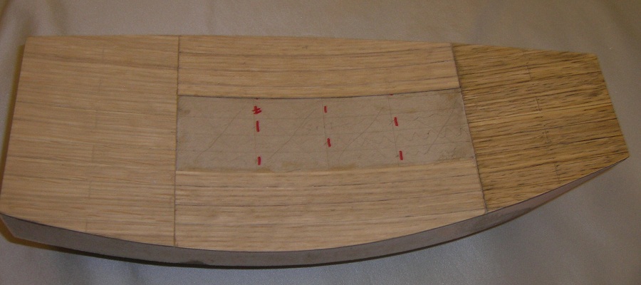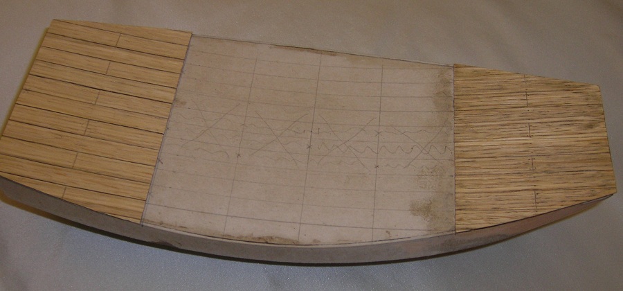 Na pokładzie (bez wyciętych otworów na nadbudówki), rozrysowałem poprzecznie 8 równych części ,co ma odpowiadać ½ długości desek oraz układ podłużny desek szerokości 10mm. . Pozdrawiam i przepraszam za jakość zdjęć.