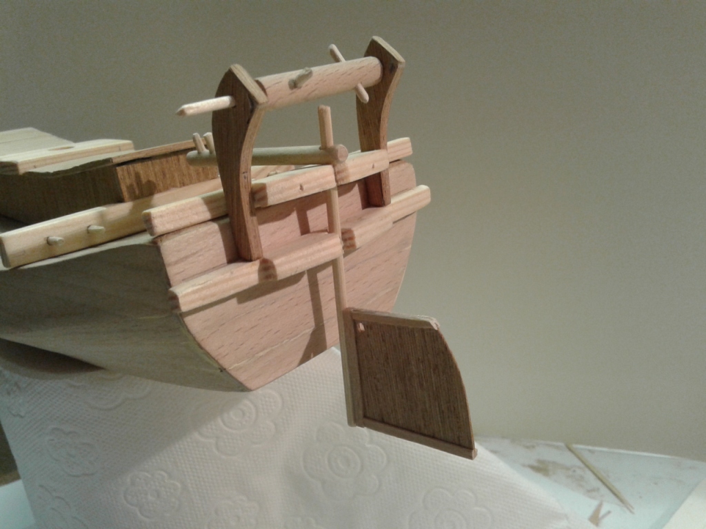 Teraz parę słów na temat samego modelu: konstrukcja kadłuba i pokład powstały z bardzo niewdzięcznego materiału, a mianowicie ze starego tekturowego segregatora - materiał sztywny ale w dalszej obróbce był makabryczny, nie polecam nikomu, burty z tektury 1 mm. Na pokład i daszek nadbudówki poszedł fornir chyba dębowy (kruchy i ciężki w obróbce), burty z forniru bukowego, belki poprzeczne, bukszpryt, mocowanie steru z listewek sosnowych (OBI), maszty z wałków bukowych (OBI). Nadbudówka oklejona fornirem o którym nie mam pojęcia z czego mógł być zrobiony. Do innych pierdół użyłem wykałaczek, bambusowych patyków do szaszłyków, drewnianej łyżki (???) i tego co było pod ręką.