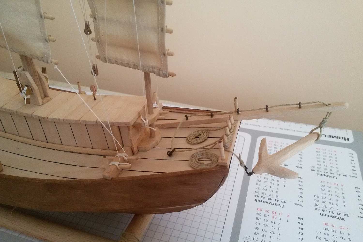 Na ostatnim zdjęciu mocowanie żagla bardzo przypomina rolki po których poruszał się szkielet żagla. Co prawda kogowej "Dżonce" trochę brakuje do wielkiego okrętu wojennego jednak warto wypróbować różnych metod. Dżonka to dobra nauka i jeszcze lepsza zabawa.