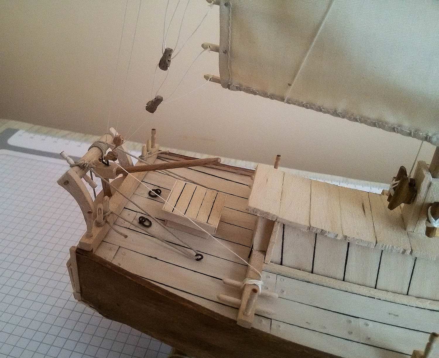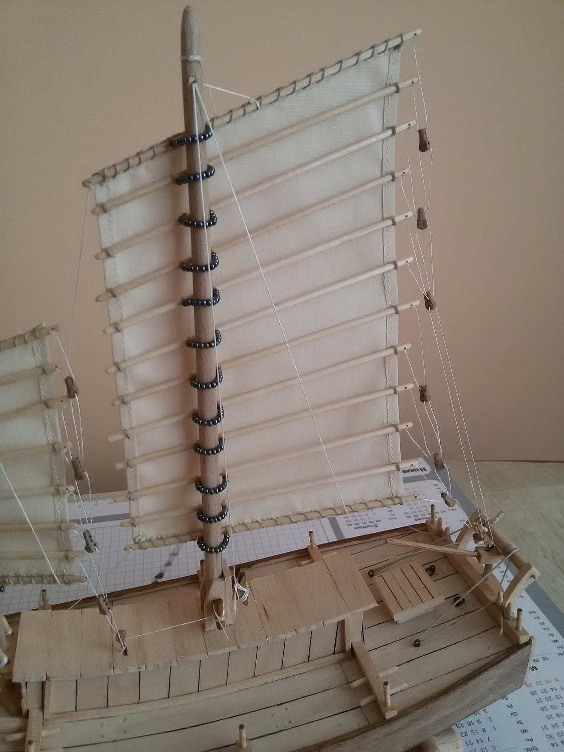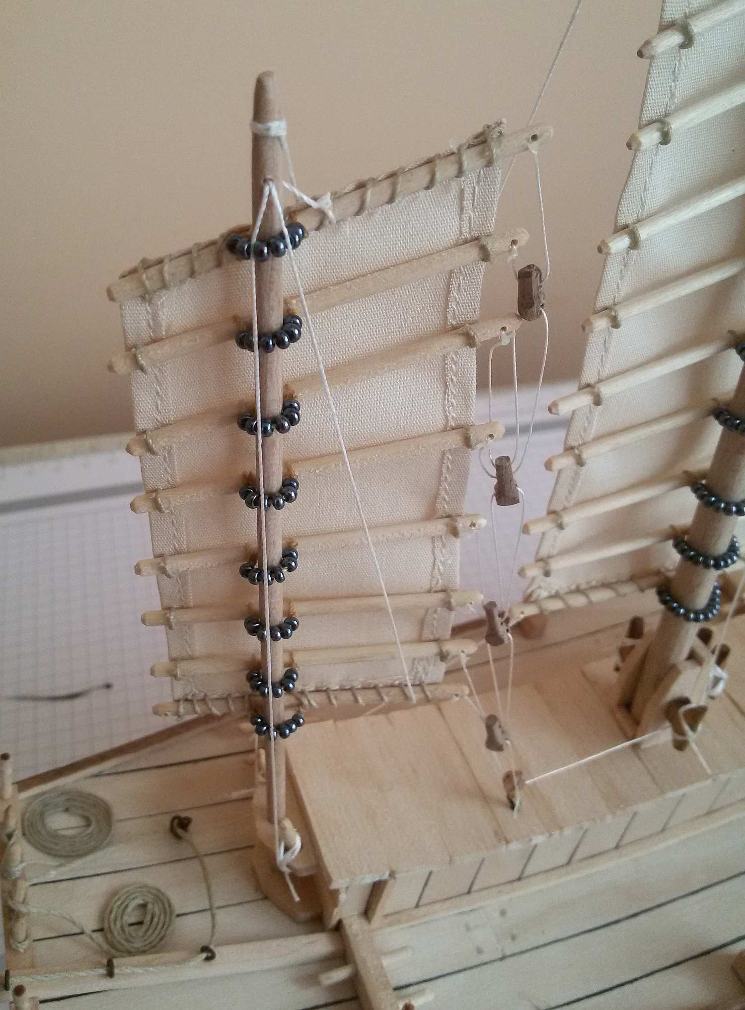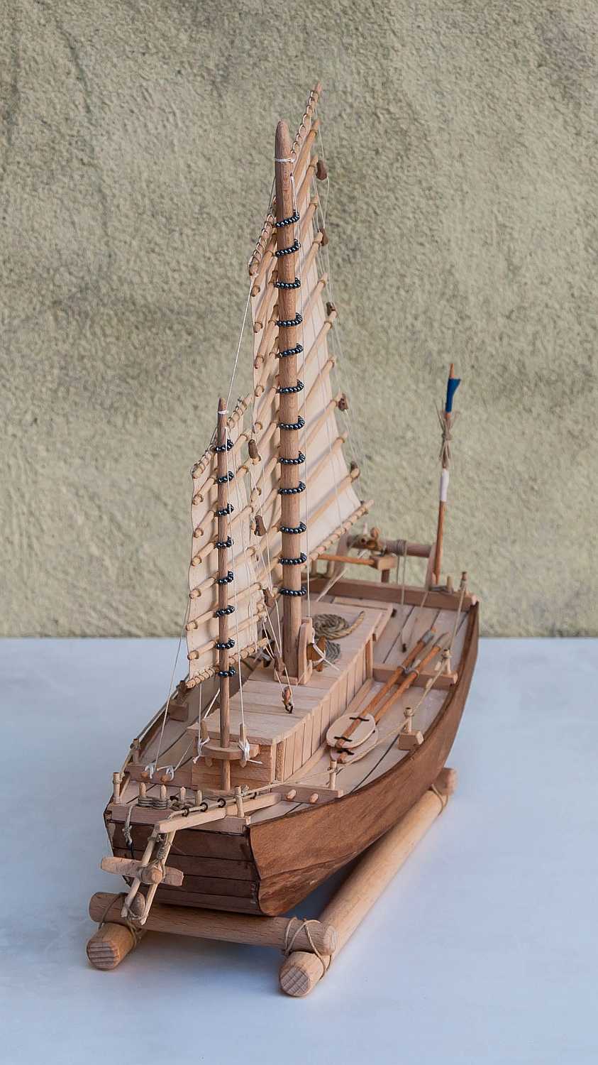 Jeśli mogę wtrącić coś jako początkujący budowniczy dżonki - kawał dobrej roboty. Nie podoba mi się tylko mocowanie żagli do masztów. Patrząc jak biedne były to łodzie, Twoje rozwiązanie wydaje mi się zbyt "bogate". Chyba, że powinno tak być?
