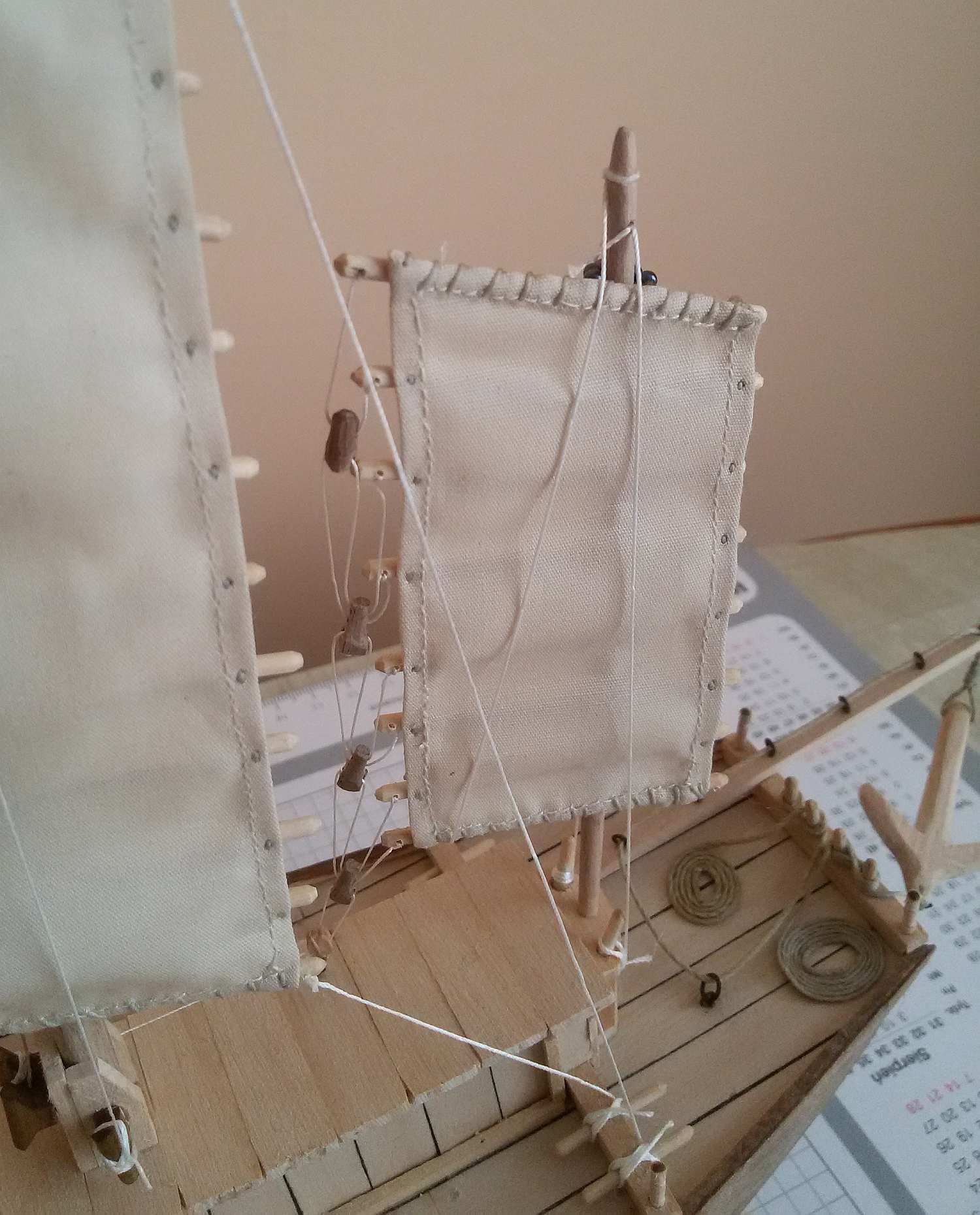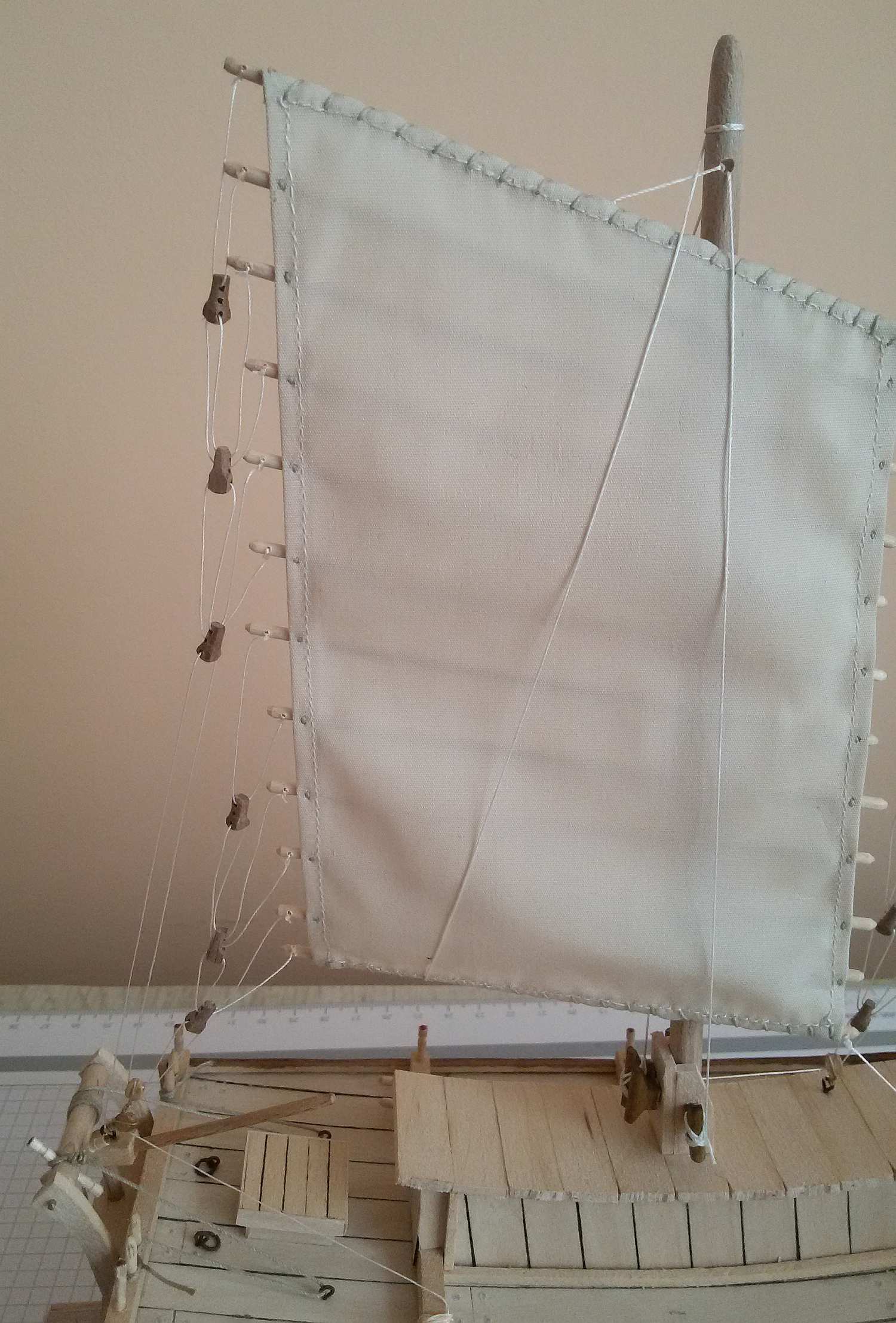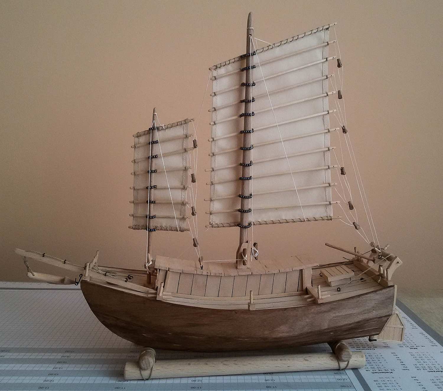 Jeśli mogę wtrącić coś jako początkujący budowniczy dżonki - kawał dobrej roboty. Nie podoba mi się tylko mocowanie żagli do masztów. Patrząc jak biedne były to łodzie, Twoje rozwiązanie wydaje mi się zbyt "bogate". Chyba, że powinno tak być?