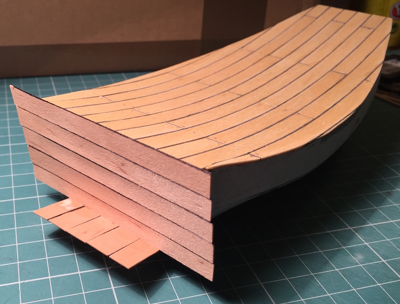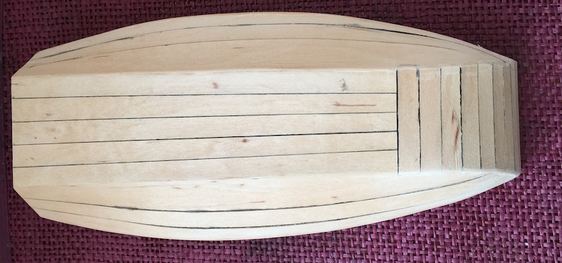 następnie pokład (dałem ciała z symetrycznym rozkładem poszczególnych desek, nie uwzględniłem szerokości czarnego brystolu wklejanego pomiędzy poszczególnymi deskami: