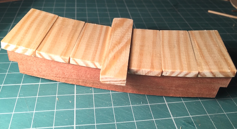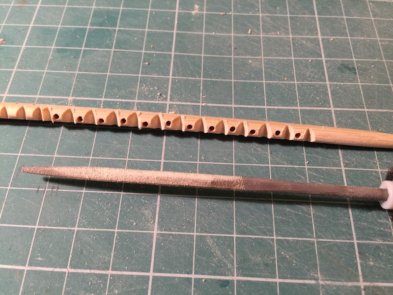 Obecnie cieniutko u mnie z materiałem, listeweczki zrobiłem sklejając ze sobą 3 deseczki z obłogu Brzozy po 1,5 mm grubości. Elementy na rufie wykonane z linijki bukowej. Patyczki to wykałaczki.
