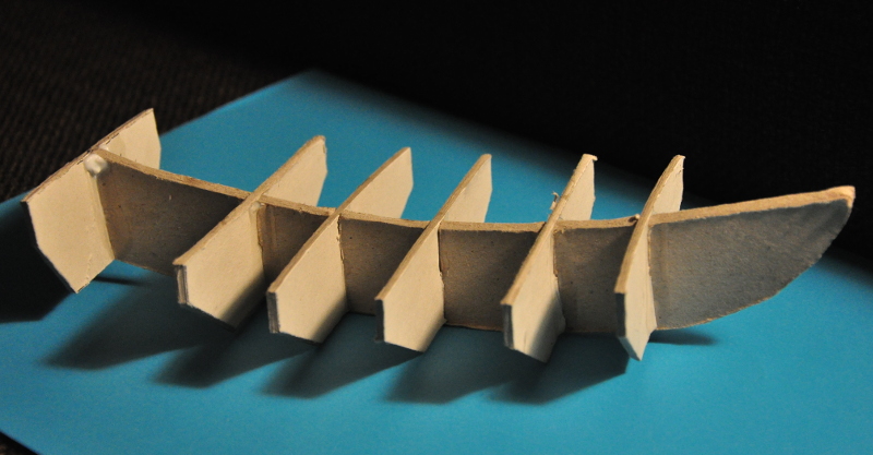 Materiały podrukowane, tektura zakupiona, no to jadę. Wyciąłem elementy szkieletu, spasowałem, skleiłem, dokleiłem pokład. Może być. Wziąłem się się za konstrukcję podstawki pod model, i też powycinałem, posklejałem, ale podstawka już nie była "może być" Powycinałem jak siekierą, krzywa w dodatku źle spasowana. No dobra, to podstawka idzie do kosza. Robimy od nowa. Tym razem zdecydowałem się nie korzystać z gotowca, a sam wyrysowałem wszystko co mi do niej potrzeba, powycinałem przykładając się zdecydowanie bardziej niż wcześniej do tego zabiegu. No i jest. Wygląda fajnie, choć na razie to tylko szkielet. Postawiony koło szkieletu modelu wyglądał od niego o niebo lepiej. Wtedy przypomniało mi się coś co rzuciło mi się w oczy w podpisie w jednej z relacji: "jeśli to co zrobiłeś może być, to zrób to raz jeszcze". Pomimo niemal fizycznego bólu na myśl o ponownym wycinaniu wszystkiego od nowa, została podjęta decyzja o restarcie. Szkielet wycięty ponownie, po 100kroć lepiej spasowany, wygląda jak na moje niesprawne oko, dobrze. A satysfakcja z tego, że jest, ogromna.