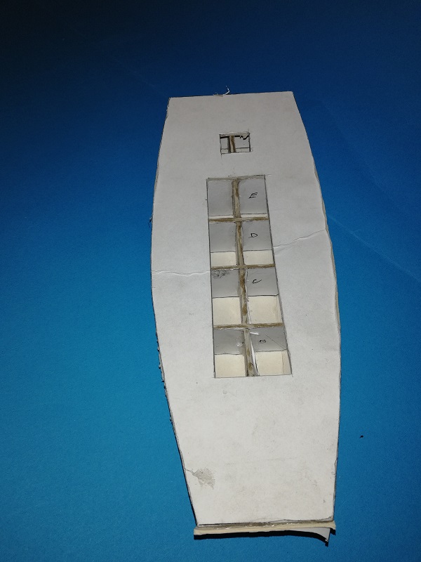Stępka widoczna na rufie (mały otwór) nie jest wyśrodkowana w wycięciu, ale na tylnej grodzi jest prosta. Nie wiem czemu tak się stało.