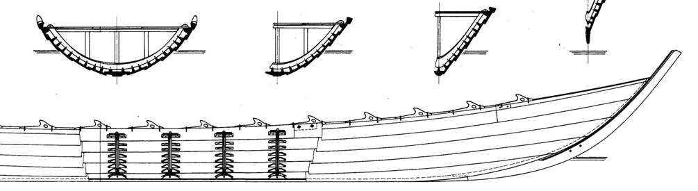 Natomiast na rycinach obrazujących łódź z Nydam widać że wszystkie klepki łączono z wręgami za pomocą wiązania.