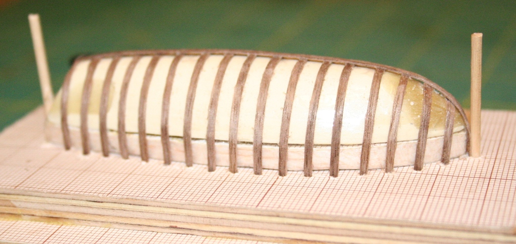 Kopytko zostało oklejone taśma bezbarwną ( zaczerpnięte z Forum ) - okazało się, iż to rewelacyjny patent. Szalupa odeszła od kopyta bez żadnego problemu i wysiłku ( można powiedzieć, że sama odpadła do odcięciu "wąsów". Materiał to orzech amerykański. Poszycie - deski 2 mm z cieniowane z 2 stron do około 2/3 - 1/2 szerokości deski.