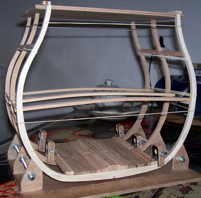 Więc tak, wręgi otrzymały okleinę imitującą ich właściwe złożenie, okleina z chyba po waszemu to obłóg?, w każdym razie grubości 1mm, wykonana z deseczek skrzynek owocowych, po przeszlifowaniu wręgi, łączenia poszczególnych elementów są bardzo mało widoczne, mam nadzieję że trochę się pokażą jak się to potraktuje bejcą. Wręgi wypionowane i skręcone śrubami na prętach stoją równo i sztywno, więc nie potrzebuję robienia dodatkowej listewki pionującej, tak jak u Romka, zresztą jak słusznie zwrócił uwagę stocznia jest za krótka i nie ma za bardzo miejsca na taką listew. Rozpocząłem kładzenie poszycia, jak na razie moje zaciski sprawują się dobrze. Stan na dzisiaj poniżej.