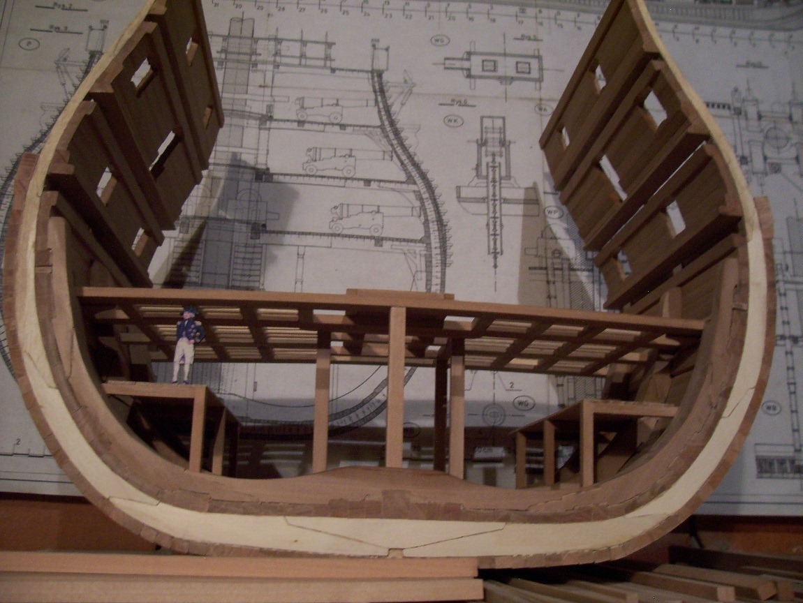 Prace po kawałku do przodu, przekrój odcięty od "pępowin" stoczni, wręgi pocienione, teraz pokrywają się z planem generalnym. Cały czas pochodzą planki poszycia zewnętrznego, w międzyczasie zająłem się wnętrzem kadłuba i konstruuję pierwszy pokład. I tu mi wyszedł na jaw babol, gdzieś się pomyliłem w obliczeniach i pozostawione otwory do montażu dolnego pokładu są za wysoko, co za tym idzie za wysoko są też wewnętrzne wręgi. Uniemożliwia mi to zamontowanie pokładników w przeznaczonych im miejscach,aby nie rujnować prawie wszystkiego, zamontowałem je lekko przesunięte i obniżone, nie są też "wpuszczone" a przyklejone do czoła. Cały pokład będzie odeskowany, nie będzie widać tego błędu.