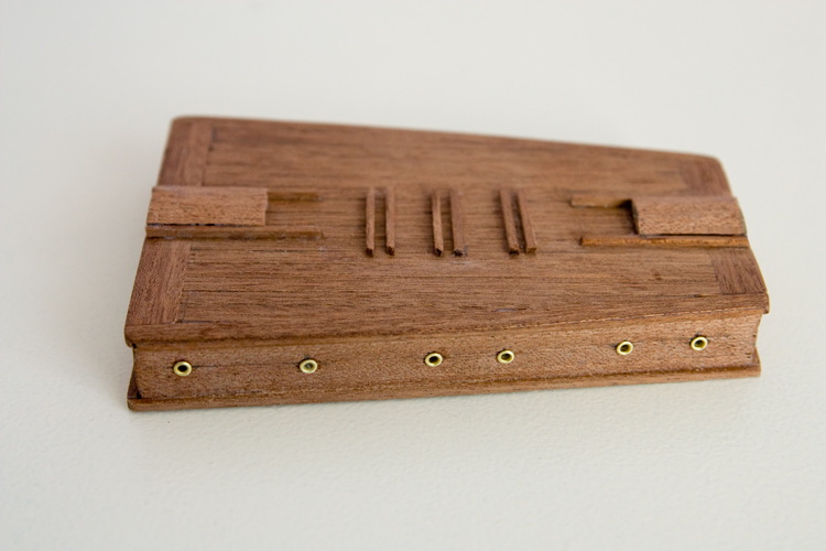 Ponieważ pokład w tym zestawie wykonany jest ze sklejki brzozowej, a w realnym pokład i nadbudówki są w kolorze pomarańczowo czerwonym (jasny mahoń) zdecydowałem się dać pokład z mahoniu tak jak wykonane są nadbudówki.