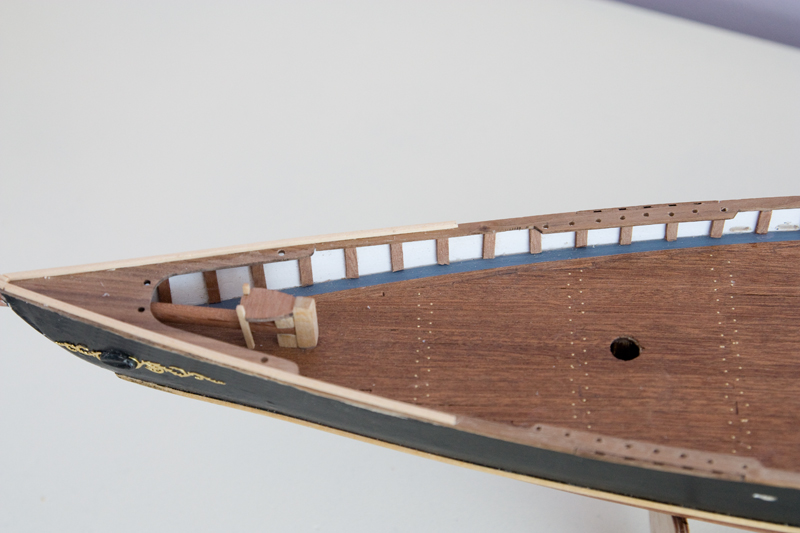 W tej chwili mam kadłub przygotowany do położenia drugiej warstwy poszycia i zrobione parę elementów wyposażenia pokładu.