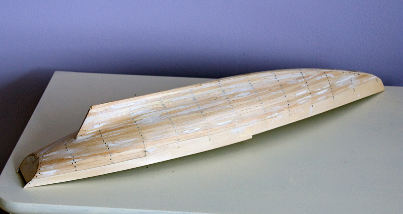 Dalszy ciąg pracy przy kadłubie. Ułożyłem drugą warstwę poszycia, pomalowałem burty a część podwodną pociągnąłem olejem lnianym.