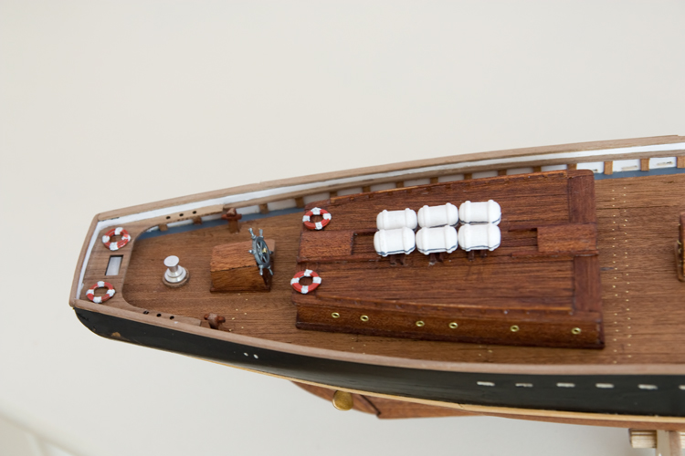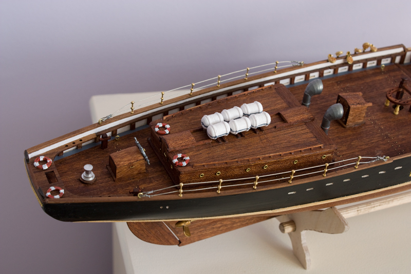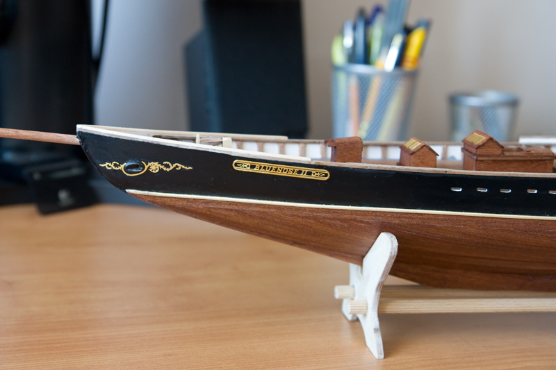 Ponieważ pokład w tym zestawie wykonany jest ze sklejki brzozowej, a w realnym pokład i nadbudówki są w kolorze pomarańczowo czerwonym (jasny mahoń) zdecydowałem się dać pokład z mahoniu tak jak wykonane są nadbudówki.