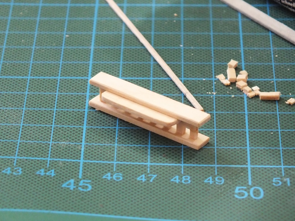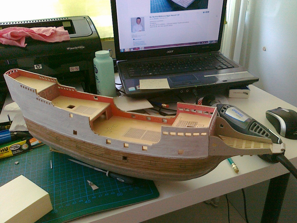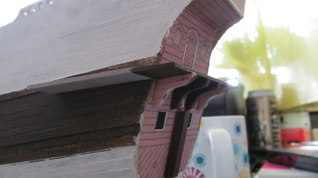 Oprócz kołkownic próbowałem wykonać przy pomocy szlifiereczki, wykałaczek i iglaków pierwsze nagle. Myślę, że jak jeszcze troszkę poćwiczę, to moje nagle będą bardziej powtarzalne. Ławy wantowe grotmasztu i fokmasztu wykonałem z deseczki bukowej 3 mm przy pomocy miniszlifierki i pomalowałem farbami akrylowymi. Rozpocząłem także montaż galeryjki rufowej. Wycinam ją nożem typu skalpel z tektury impregnowanej o gr. 1,5 mm, szlifuję papierem i sklejam przy pomocy kleju cyjanoakrylowego w żelu. Podpory rufowe galeryjki wykonałem z deseczki bukowej, a burtowe z tektury. Galeryjka jest jeszcze nie skończona, gdyż na tym etapie muszę pociągnąć wyżej burt malowanie. Teraz jeszcze jako tako mogę malować, ale gdybym miał kompletną galeryjkę, to miałbym problem z malowaniem. Na modelu pojawia się farba oraz listwy no i tak po troszeczku do przodu.