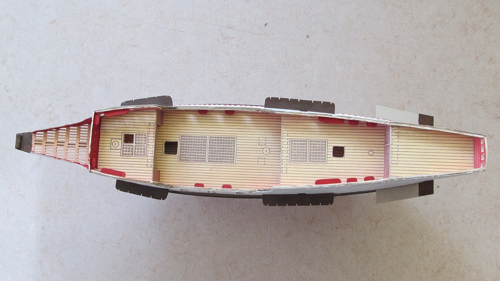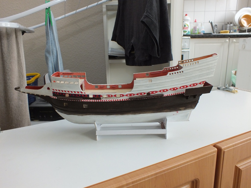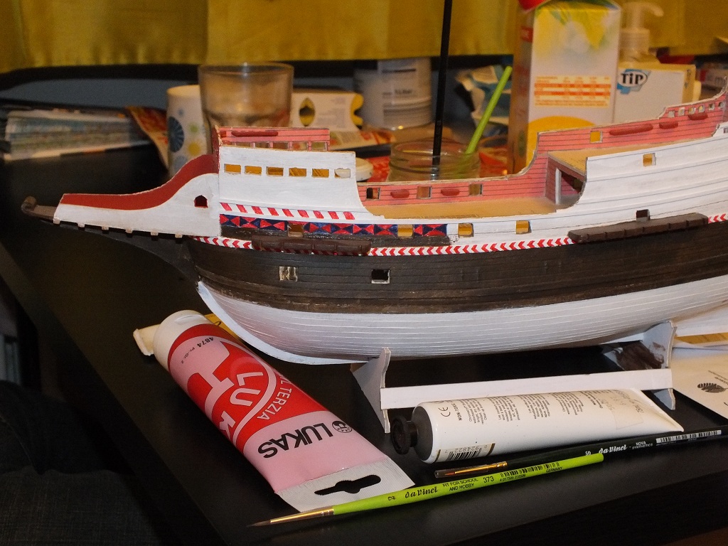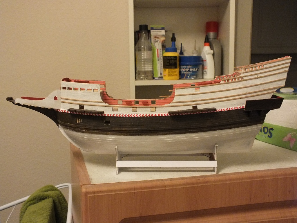 Zrobiłem listwy na burtach i pomalowałem. Nie napisałem wcześniej ale listwy wykonałem z listewki bukowej tnąc ją wzdłuż na pilarce proxxona KS230. Listewki maja wymiar 1,9 mm na 1 mm. Miejscami pilarka "obskubała" listewki więc myślę, że buk nie był najszczęśliwszym wyborem. Niemniej wykorzystałem dobre kawałki. Po naklejeniu listew - malowanie. Jeśli chodzi o dalszy etap, to myślę, że po pomalowaniu kadłuba zrobię wzmocnienia burt na śródokręciu i furty działowe, a następnie skończę balkonik i przejdę na pokład lub zrobię ster.
