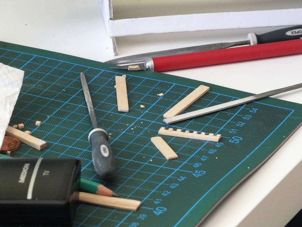 Z tektury grubości 1,2 mm wykonałem większość kołkownic. Wg planów wszystkie mocowane do wewnętrznych części burt. Z zaimpregnowanej tektury, po przeliczeniu i narysowaniu kształtów wyciąłem wszystkie niezbędne elementy. Krawędzie i niedokładności zeszlifowałem papierem ściernym (120 grad). Przed przyklejeniem pomalowałem elementy farbami akrylowymi. Nagielbanki jeszcze nie mają otworów na kołki.
