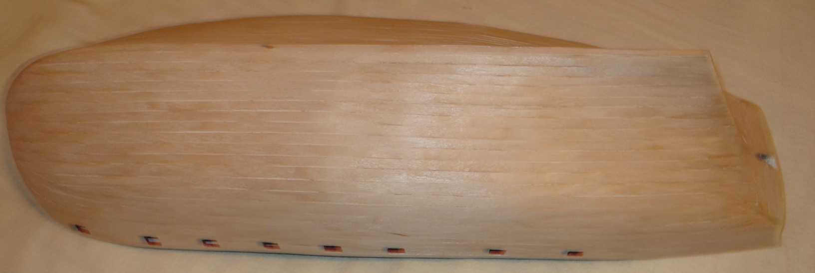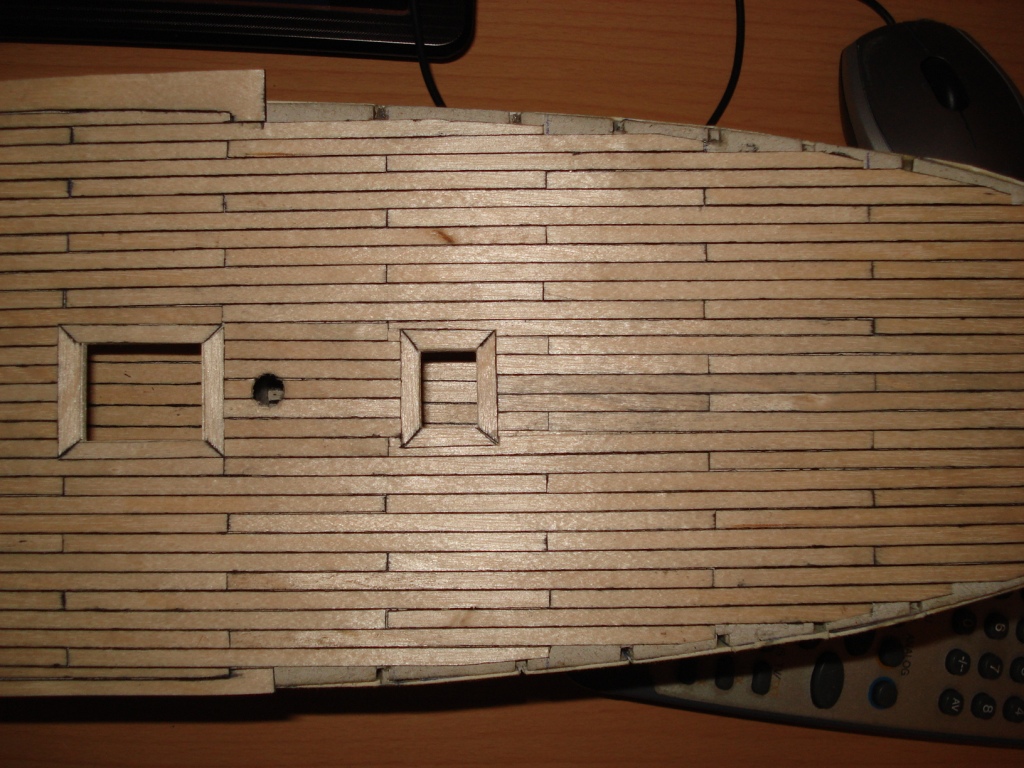 5) po ulozeniu i naklejeniu wszystkich planek na podpokladzie z cieniutkiej sklejki (tak, aby czarna linia styku utworzona byla przez tylko JEDNA czarna krawedz sasiadujacych listewek), hebluj tak zbudowany poklad ostra krawedzia stluczonego szkla, albo tez odpowiedno ostra krawedzia specjalnej grubej zyletki (tzw. industrial razor), czy tez innego narzedzia, dluta lub malego drapaka. Nigdy nie uzywaj papieru sciernego, ktory tylko zamuli delikatny rysunek czarnych krawedzi planek pokladowych.