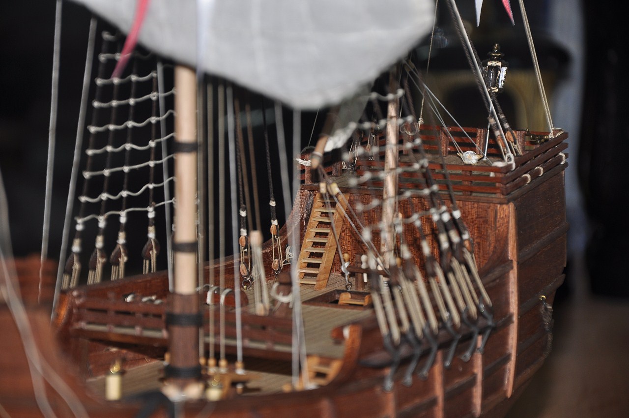 przypuszczam że bloczek (1) który jest zamocowany do pokładu i linka z prawej strony wisząca to wanty