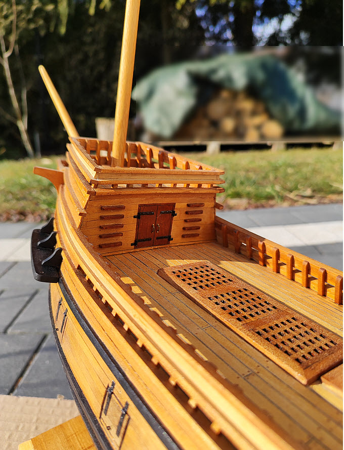 Przybyły kolejne elementy na jednej z burt – jak gunporty z zawiasami, belki do mocowania want (nie udało mi się znaleźć fachowych nazw), odświeżony/rozjaśniony kabestan, zamocowany emblemat itd…