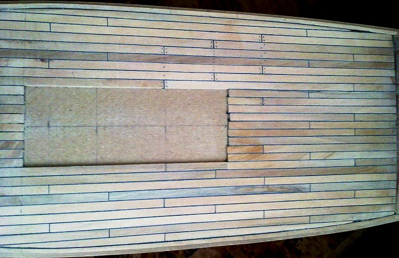 I aktualnie robiłem pierwszy pokład na tekturce – wszystko to grusza, listewki przekładane czarnym twardym papierem - tak wygląda nieoszlifowany:
