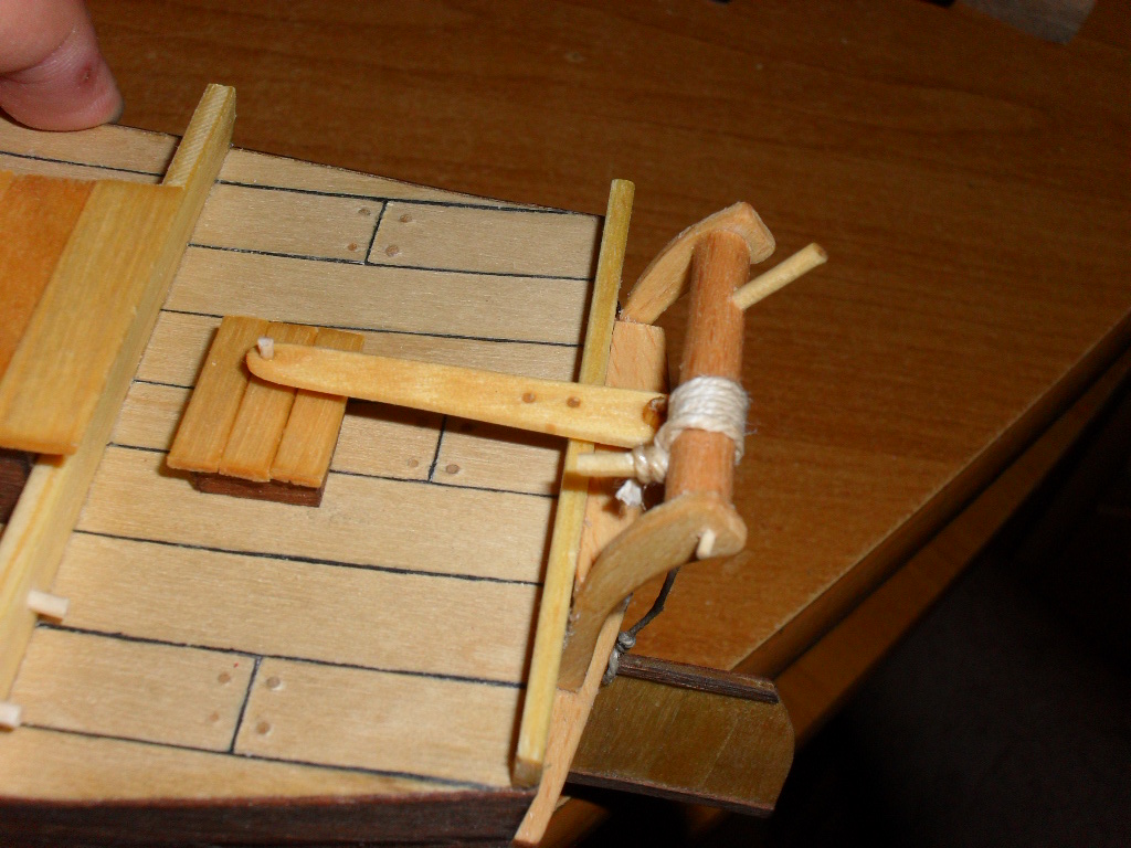 . Jak na razie kolejne elementy przybywają na model , pojawiło się mocowanie steru oraz 4 listewki przyklejone do pokładu. Ster jest włożony na sucho.