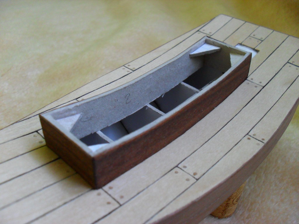 . Jak na razie kolejne elementy przybywają na model , pojawiło się mocowanie steru oraz 4 listewki przyklejone do pokładu. Ster jest włożony na sucho.