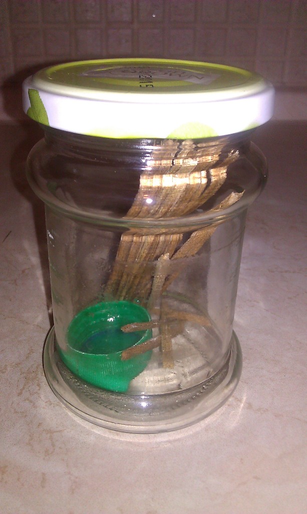 do słoika włożyłem nakrętkę z butelki pet (jako zbiorniczek), włożyłem listewki 15 sztuk dębowych i 1 sztukę sosny (tak dla testu)