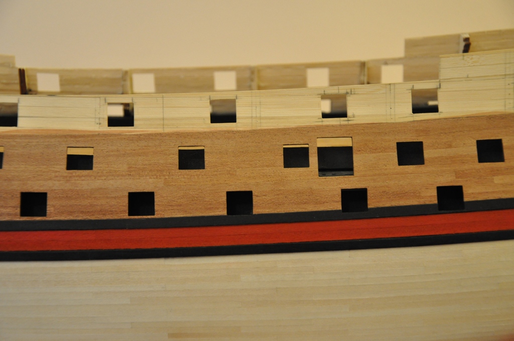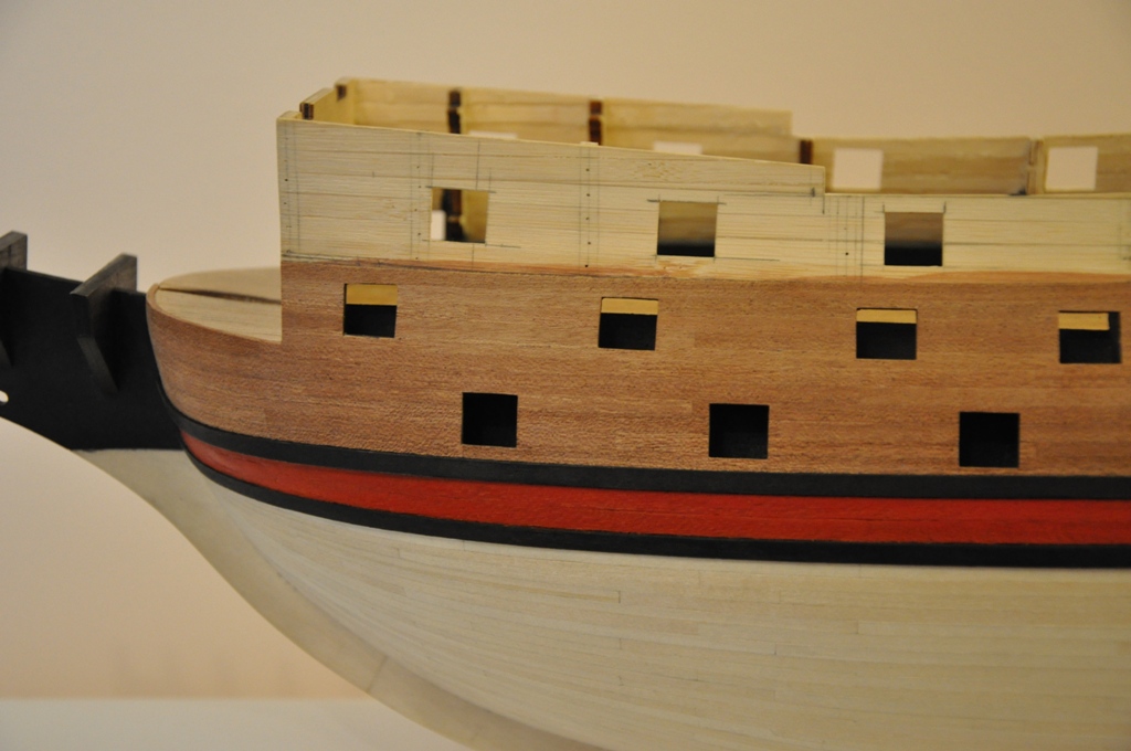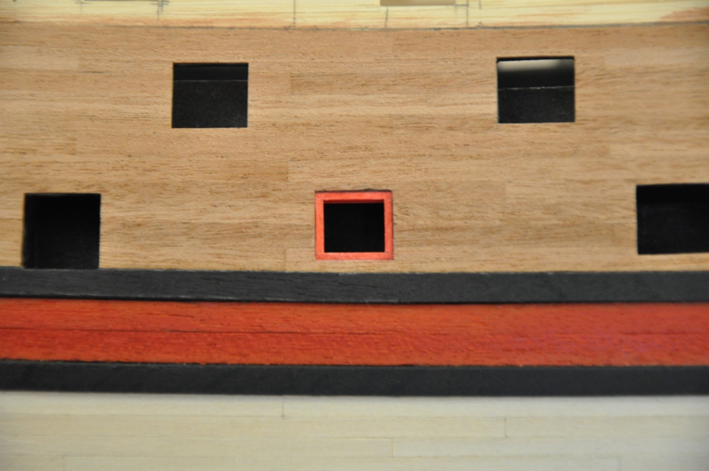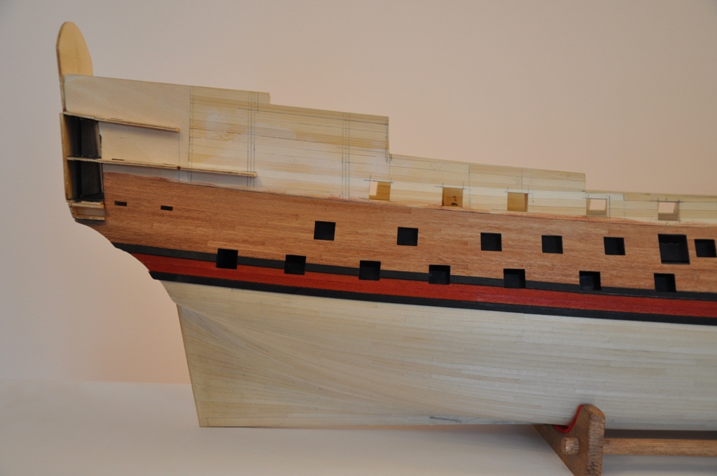 przed oklejaniem burt rozrysowałem linie planek i kadłub zabejcowałem po obu stronach aby zabezpieczyć się przed powstawaniem ewentualnych jasnych szczelin na stykach planek (np w wyniku rozsychania), powyżej tego pasa burty będą w czarnym kolorze