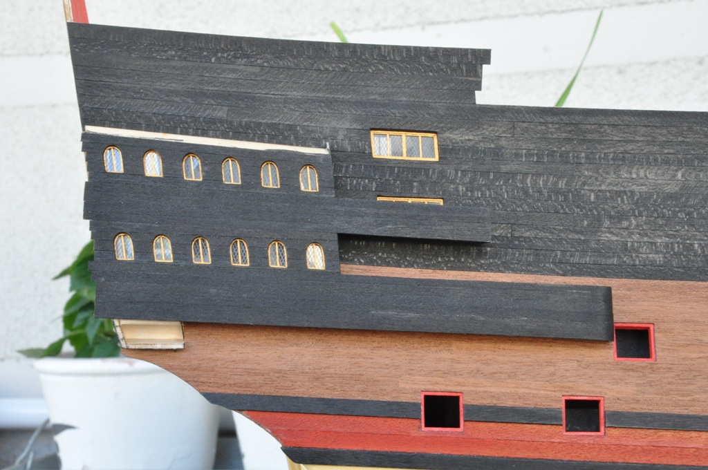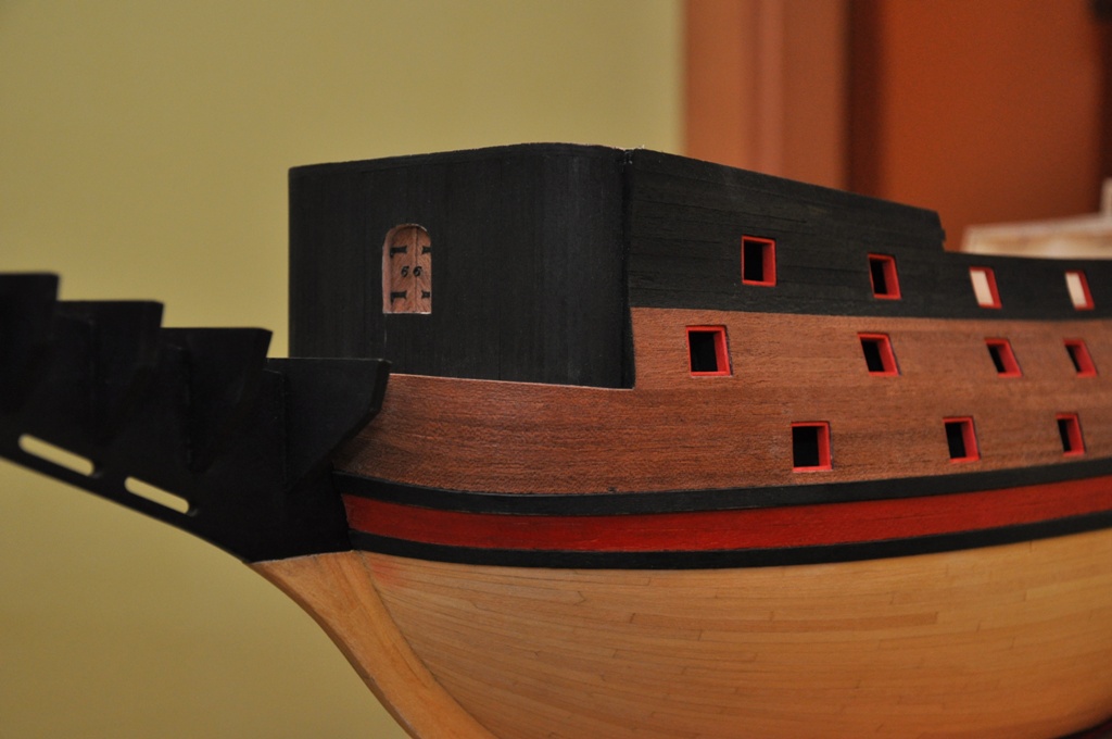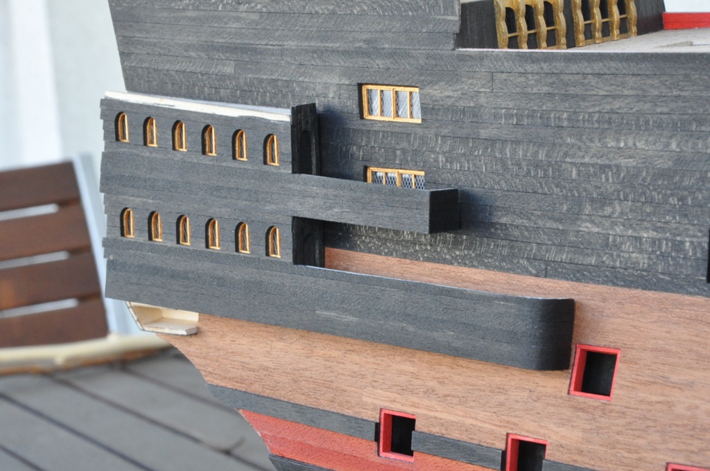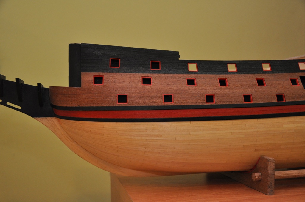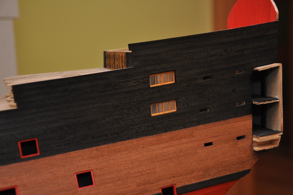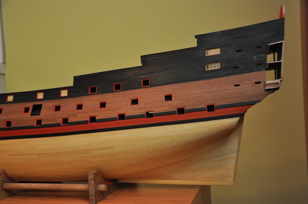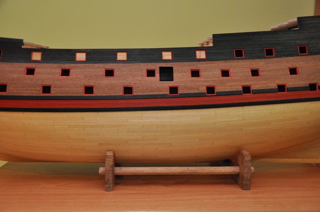 dzisiaj w zasadzie nie ma się czym chwalić, tak tego jest niewiele (chroniczny brak czasu), ale lewa burta skończona i można by tu przystąpić do wykonywania galeryjek rufowych (niektóre krawędzie będą jeszcze docięte po wykonaniu ścianek na pokładach)