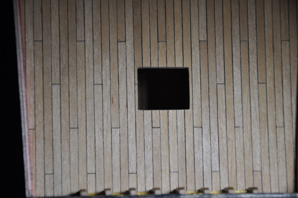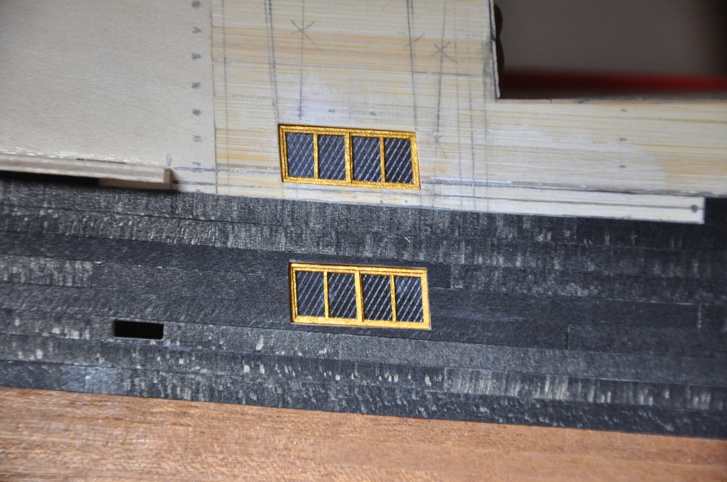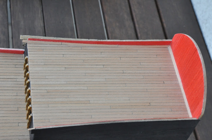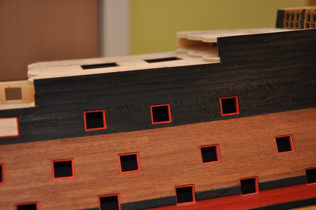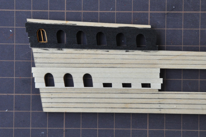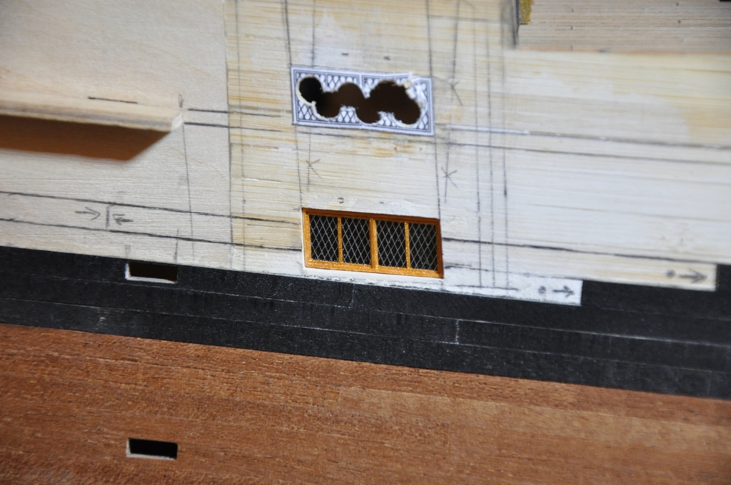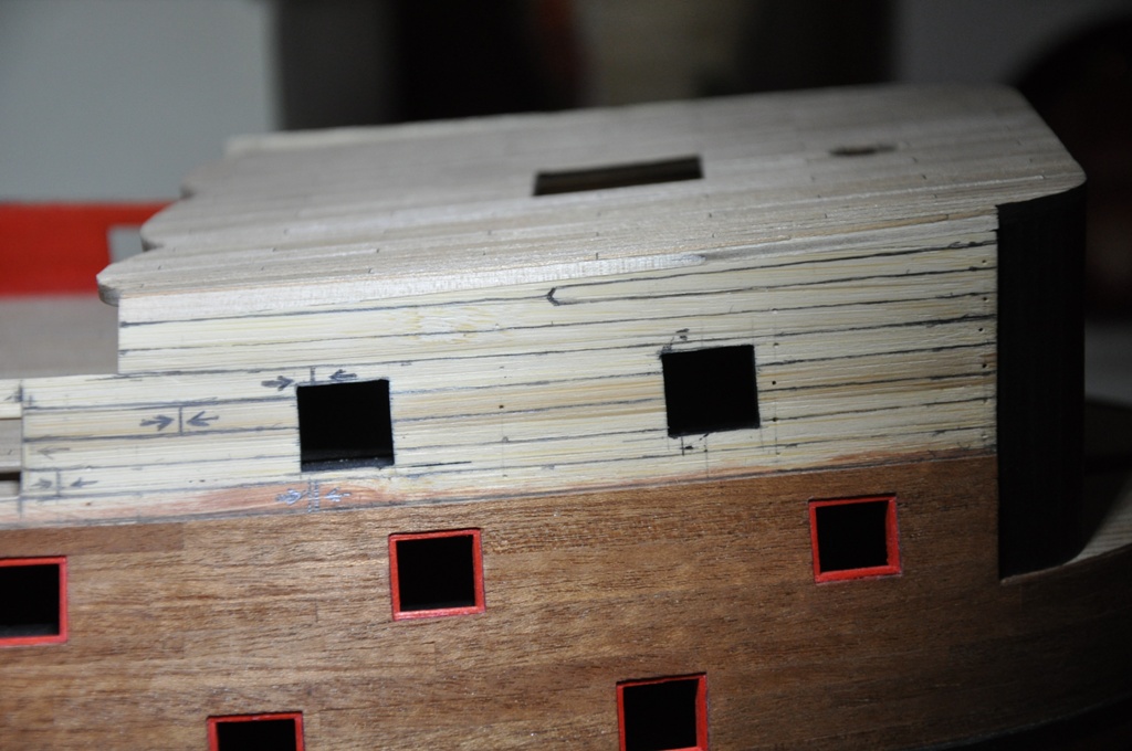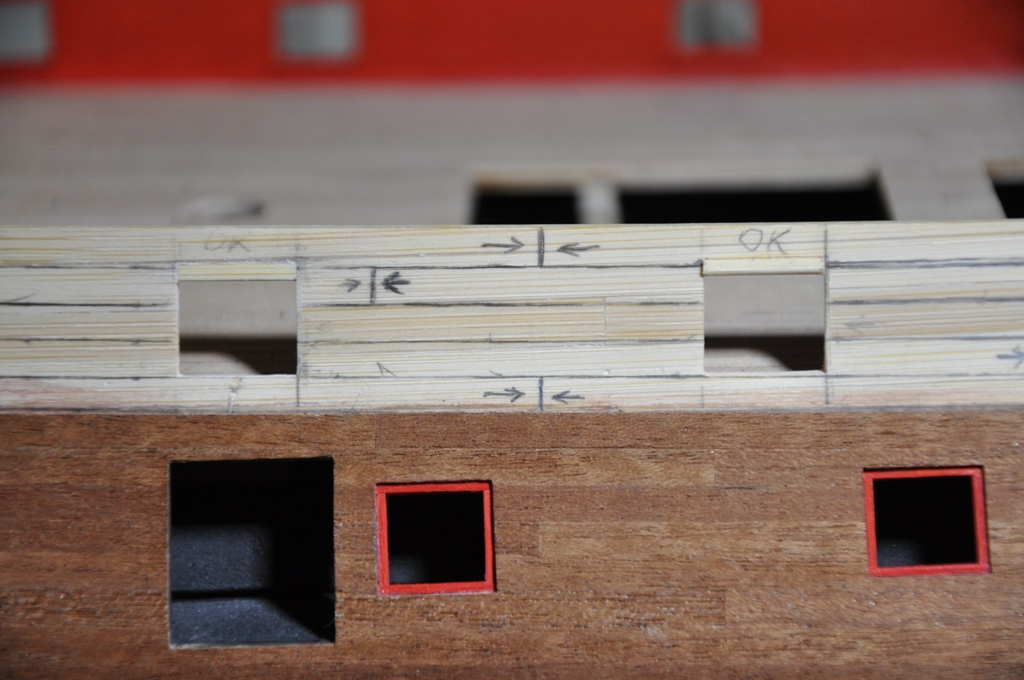 wpierw należało doprowadzić ambrazury drugiej burty do porządku by były tak samo umieszczone względem poziomych planek poszycia (należało otwory działowe delikatnie podnieść lub opuścić), wyrysowałem przebieg planek na kadłubie starając się zachować symetrię względem drugiej burty