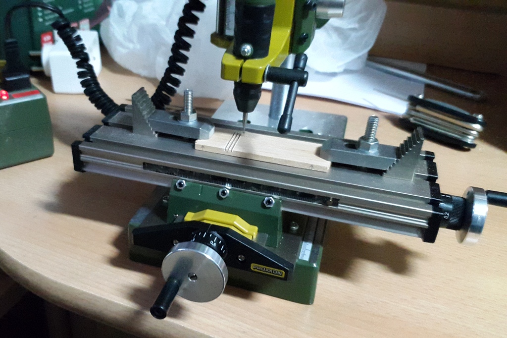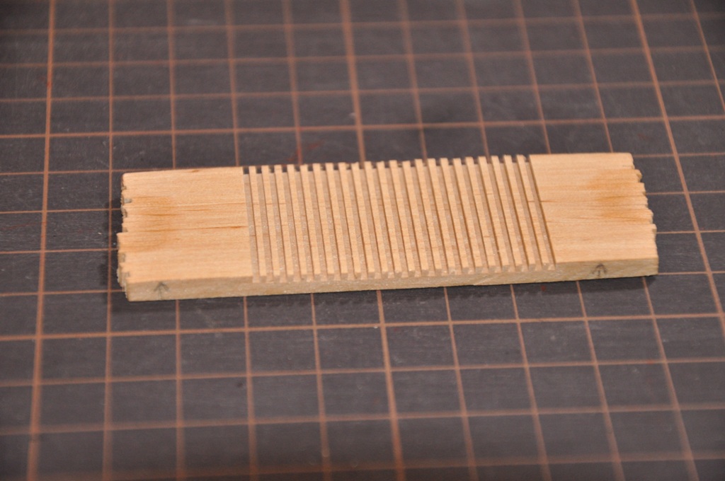 z listewek stworzyłem pakiecik (sklejony na końcach) i po wyszlifowaniu płaszczyzn wykonałem na Proxxonach gretingowe "grzebyczki"