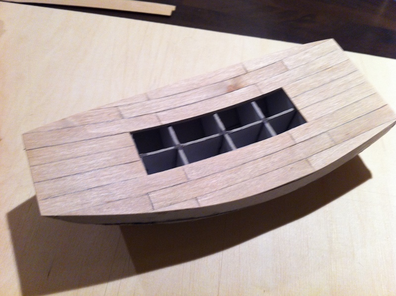 Następnego dnia zakupiłem nożyk segmentowy - z wręgami poszło zdecydowanie łatwiej. Za pomocą nożyczek krawieckich wyciąłem kształty obłe (to było wczoraj w nocy). Nacięcia w stępce jeszcze są do doszlifowania, podobnie z krawędziami - są z lekką górką więc będą dopiłowane. Dopiłowany będzie także pokład, no i oczywiście muszę wyciąć otwory
