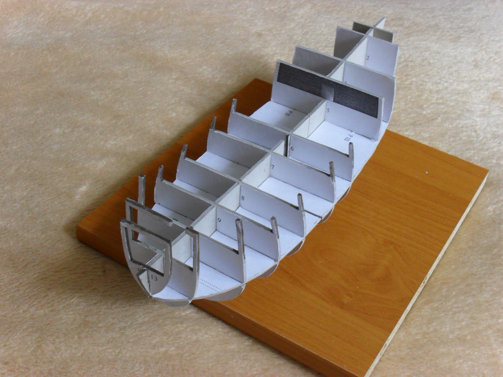 , zabrałem się za budowę szalupy na razie jestem na etapie kopyta (chyba tak to się nazywa). Kopyto ma szkielet kartonowy o grubości 1 mm. Owe kopyto zostało zapiankowane pianką montażową oraz po wyschnięciu zaszpachlowane szpachlą samochodową. Efekt poniżej: