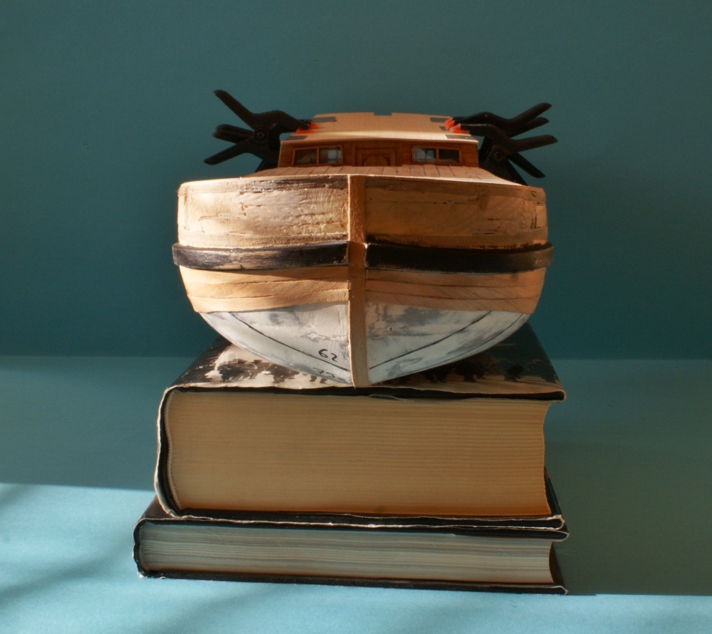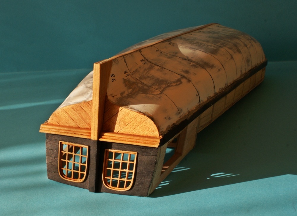 Swietnie. Teraz powinienes albo wyrysowac na kadlubie (krawedziach grodzi), albo tymczasowo popodklejac wzdluzne tzw. battens (cieniutkie listeweczki), albo tez grubsza nitke - jak w artykule Davida Antscherl'a z poprzedniego linku, dzielac kadlub na ciensze eliptoidalnego ksztaltu pasy (3 lub 4 pasy dla mniejszego modelu) tak, aby latwiej bylo potem poszywac poszczegolne pasy wypelniajac je uprzednio wyprofilowanymi plankami, idac albo ku dolowi od glownego odbojnika ku kilowi (dokladniej ku najbardziej dolnej plance tzw. garboard strake), albo odwrotnie, od kilu ku gorze do odbojnika (wale) - kierunek jak wolisz.