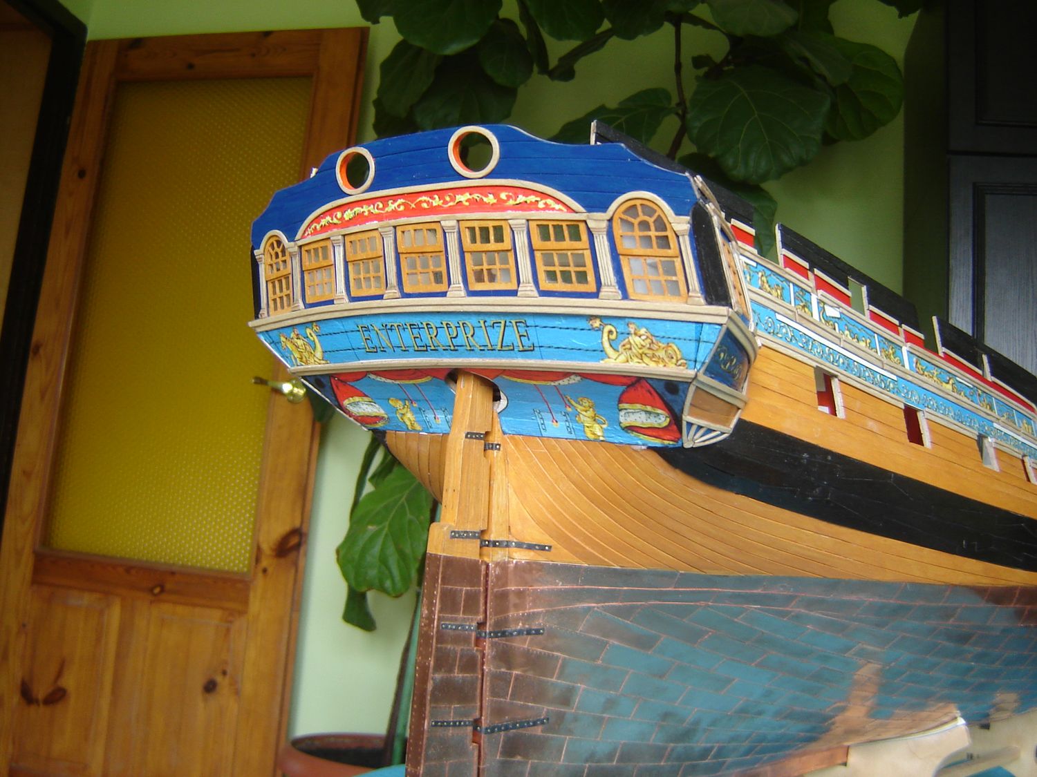 Janek ja wiem że ta kalkomania nie wygląda ciekawie, masz całkowitą rację odnośnie furt działowych na rufie. Postaram się je trochę zwaloryzować i wtedy załączę zdjęcie. A jeśli chodzi o malowanie to nie muszę próbować malować, po prostu znam swoje możliwości. W życiu robiłem różne rzeczy poprzez pracę fizyczną do prac umysłowych. Między innymi prawie własnoręcznie wybudowałem własny dom. Potrafię pomalować ściany w pokoju, naprawić dach,czy wykonać i pomalować elewację budynku, prowadzę też księgowość dla kilku moich znajomych i sam prowadzę własną działalność gospodarczą, ale malować obrazki i widoczki naprawdę nie potrafię. Chcę jeszcze powiedzieć, że mój mój model będzie miał około 180 cm długości razem z bukszprytem i tyleż samo wysokości i będzie tylko ozdobą mojego pokoju. Zamierzam wybudować model pod pełnymi żaglami i to one będą przyciągać oko potencjalnych oglądających.Kalkomania na modelu będzie się znajdowała na wysokości około 70 cm od podłogi i zapewniam Cię, że nikt z moich gości nawet jej nie zauważy. Szerokość grotżagla wraz z żaglami wytykowymi będzie około 100 cm a prześwit drzwi od mojego pokoju to 82 cm. A więc możliwe że mój Enterprize po złożeniu żagli wytykowych wypłynie kiedyś tylko w jeden jedyny dziewiczy rejs i zakotwiczy w domu jednego z moich dwóch synów jako pamiątka po ojcu. A tak na poważnie to zazdroszczę Ci twoich zdolności i ozdóbek na jachcie. Chciałbym jeszcze kiedyś wybudować jakiś model na podstawie porządnych planów i wtedy na pewno wykonam go o wiele lepiej, bo na razie jeszcze muszę się wiele nauczyć. Ufff.......... ale się rozpisałem.