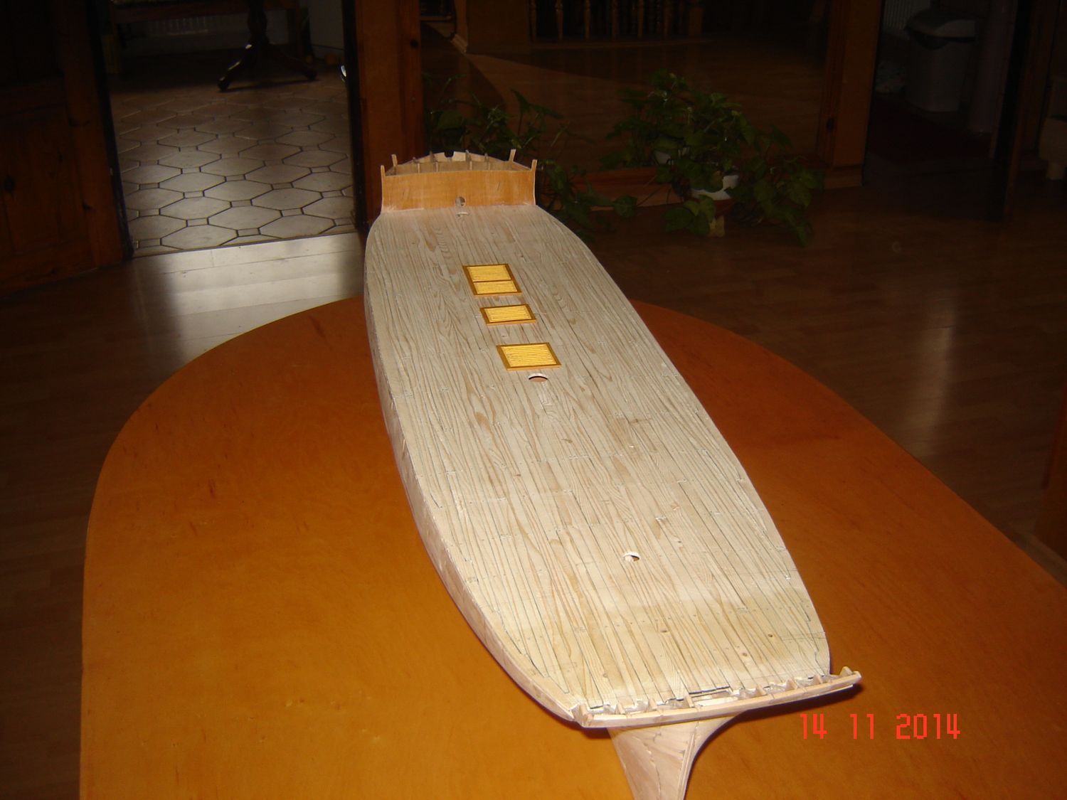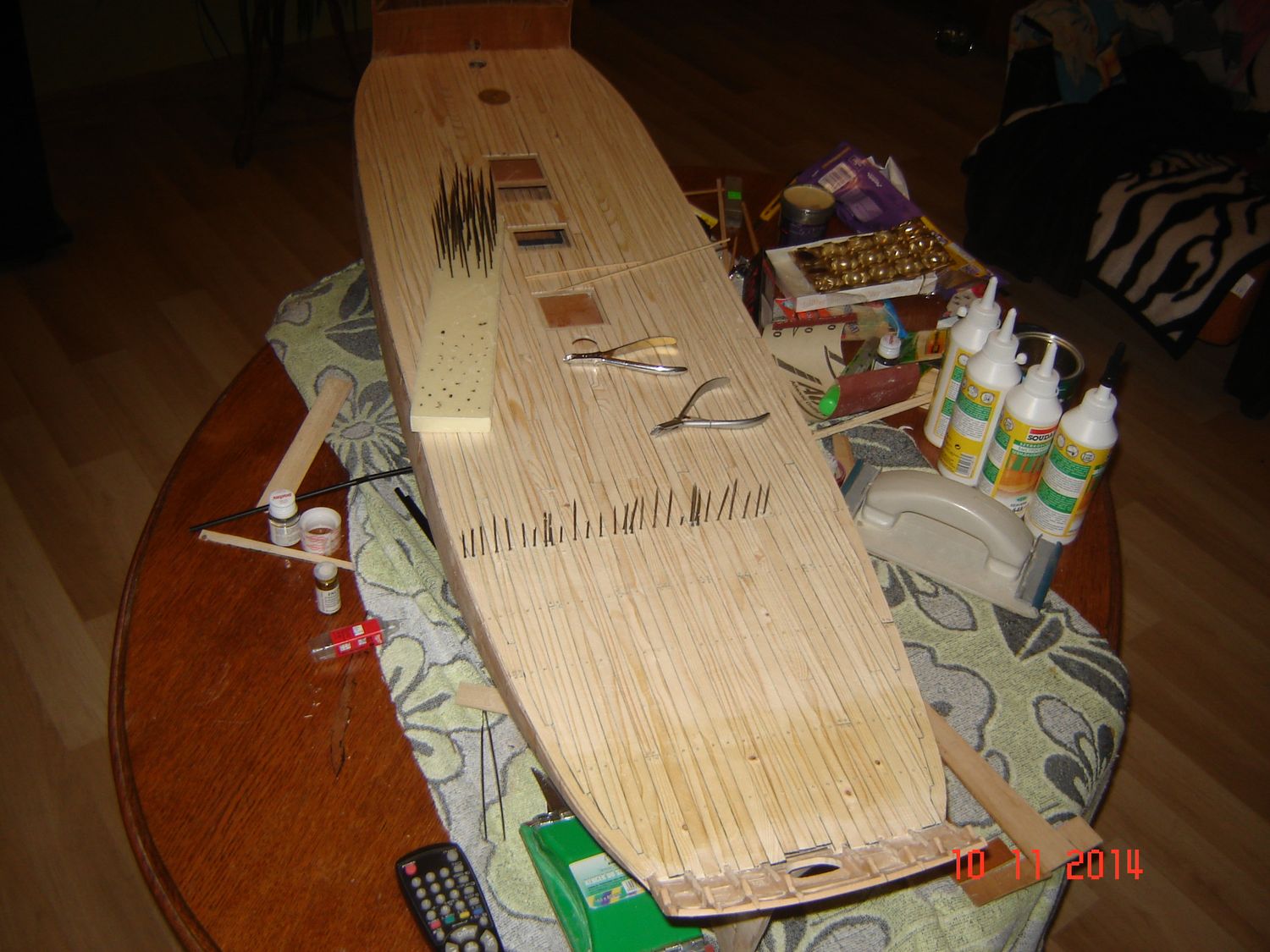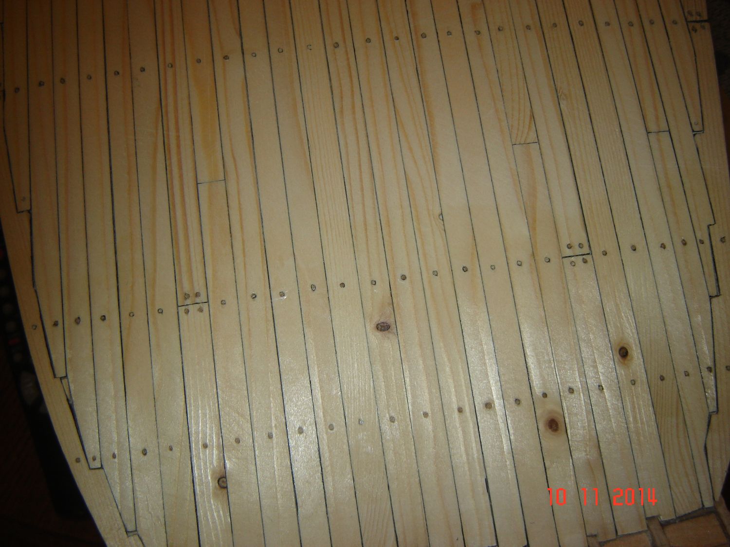 Po naklejeniu listewek na cały pokład przyszedł czas na kołkowanie.
