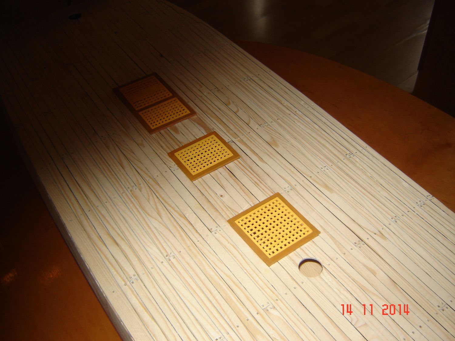 Po kołkowaniu przyszedł czas na gretingi. Wykonałem je w całości ze sklejki brzozowej lotniczej 1 mm i pomalowałem farbami akrylowymi. Przez cały czas wzoruję się na wycinankach z Shypyardu. Nie będę opisywał jak wykonywałem gretingi, bo inni na pewno robią je o wiele lepsze i tyle było na kodze opisów co do sposobu ich wykonania, że byłoby to nudziarstwem.