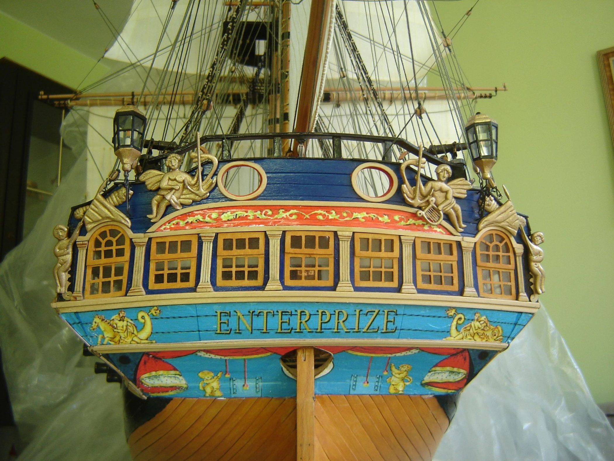 Znudziło mi się delektowanie lenistwem i wracam do modelowania. Zamontowałem flagi. Muszę jeszcze pozawieszać buchty na knagach i naglach. Zamocuję na stałe szalupy na pokładzie i zabieram się za gablotę.