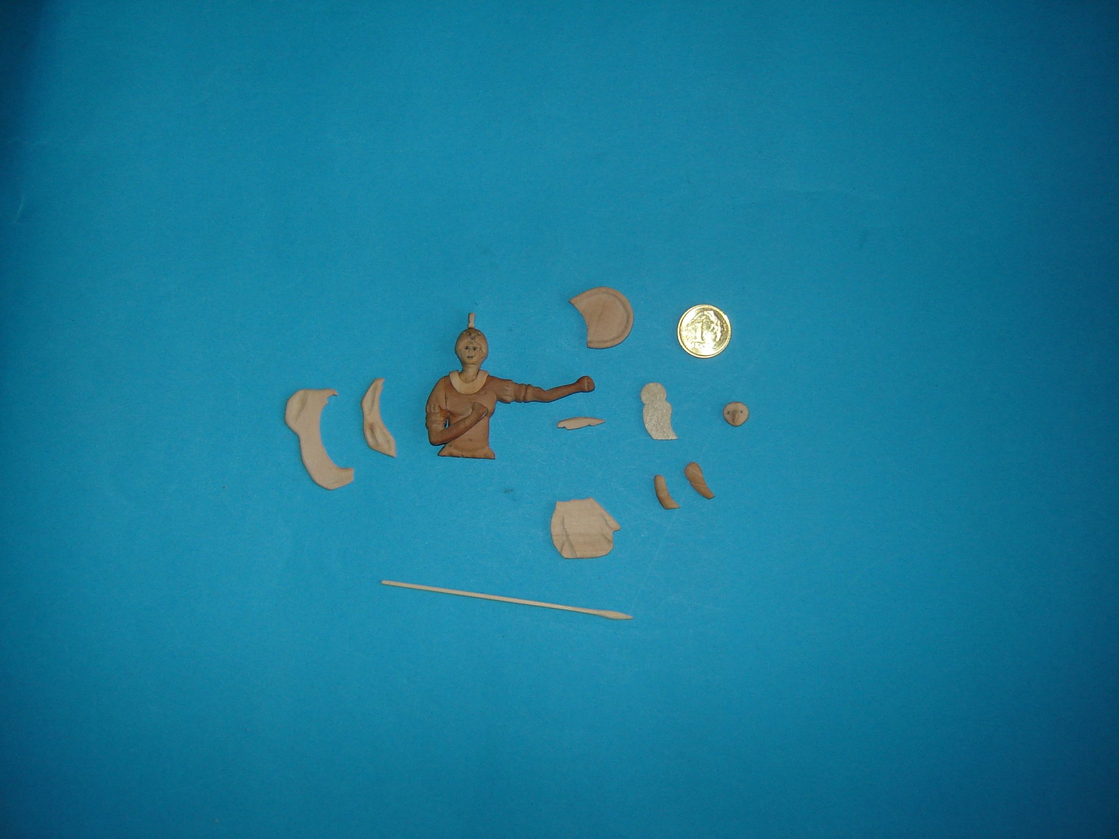 Wyciąłem i wyszlifowałem pozostałe elementy ubioru i uzbrojenia oraz elemenciki z których zamierzałem skleić sowę. Wszak Atena to nie tylko bogini wojny ale także bogini mądrości, a symbolem mądrości jest sowa. To pewna ironia gdyż na tle innych drapieżników sowa jest wyjątkowo głupim ptakiem, ale starożytni Grecy nie musieli o tym wiedzieć. To tak na marginesie.