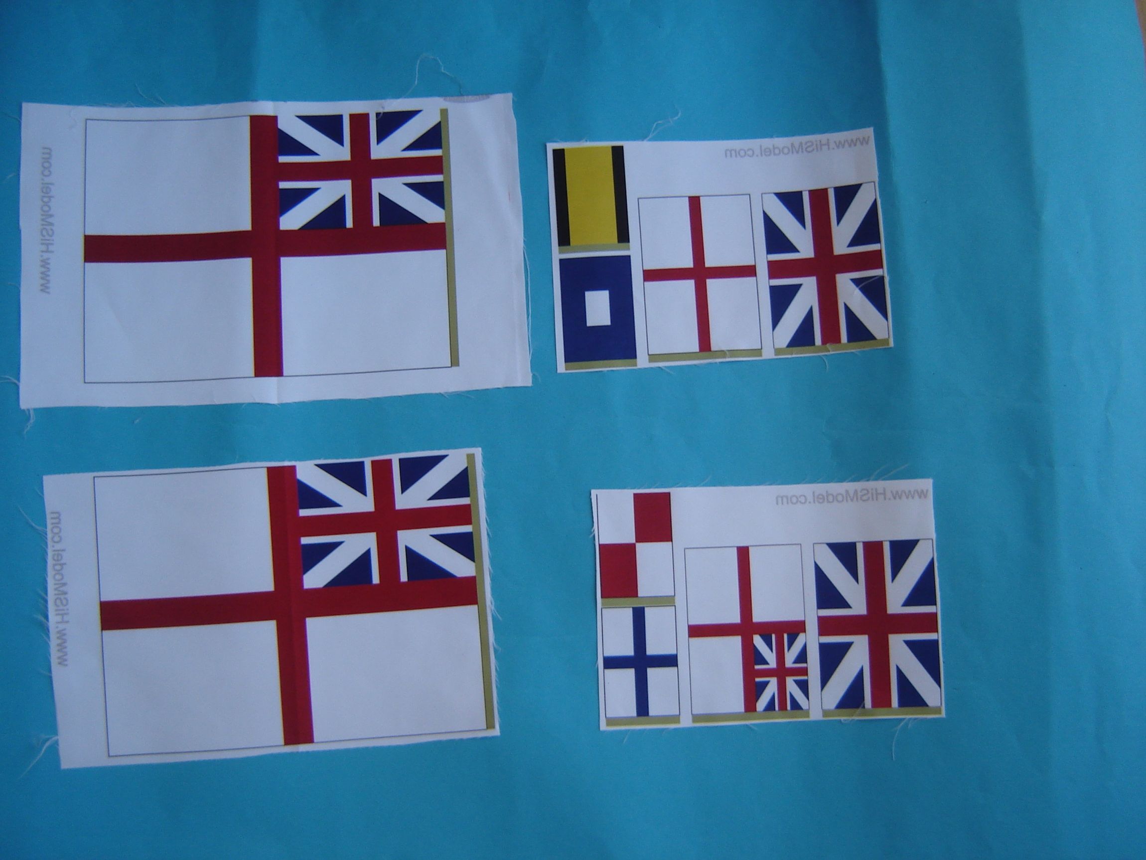 Czas zabrać się za prace wykończeniowe przy moim Enterprizie. Otrzymałem zamówione u Radka Basedy flagi. Pięknie wydrukowane obustronnie na cieniutkim jedwabiu. Żadnych zacieków czy plam. 2 największe mają wymiary 22cm x 16 cm, 4 średnie o wymiarach 10 cm x 7 cm oraz 4 sygnałówki o wymiarach 7 cm x 4,3 cm.Teraz muszę je tylko odpowiednio obrobić, uformować i zamontować na modelu.