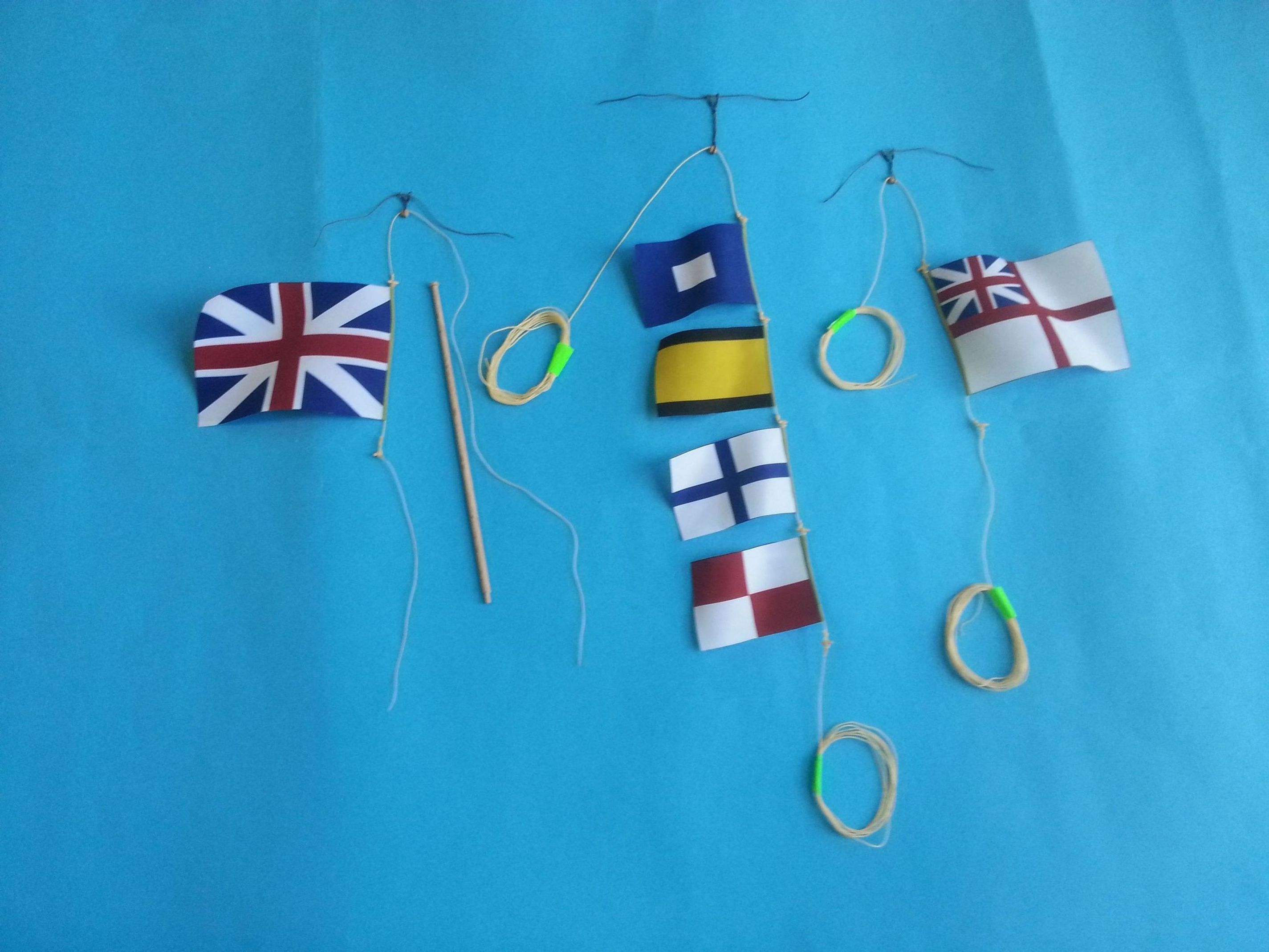 Pierwsza flaga o wymiarach 10 cm x 7 cm do zamontowania na topie grotmasztu i druga o wymiarach 22 cm x 16 cm zostanie zamontowana na gaflu.