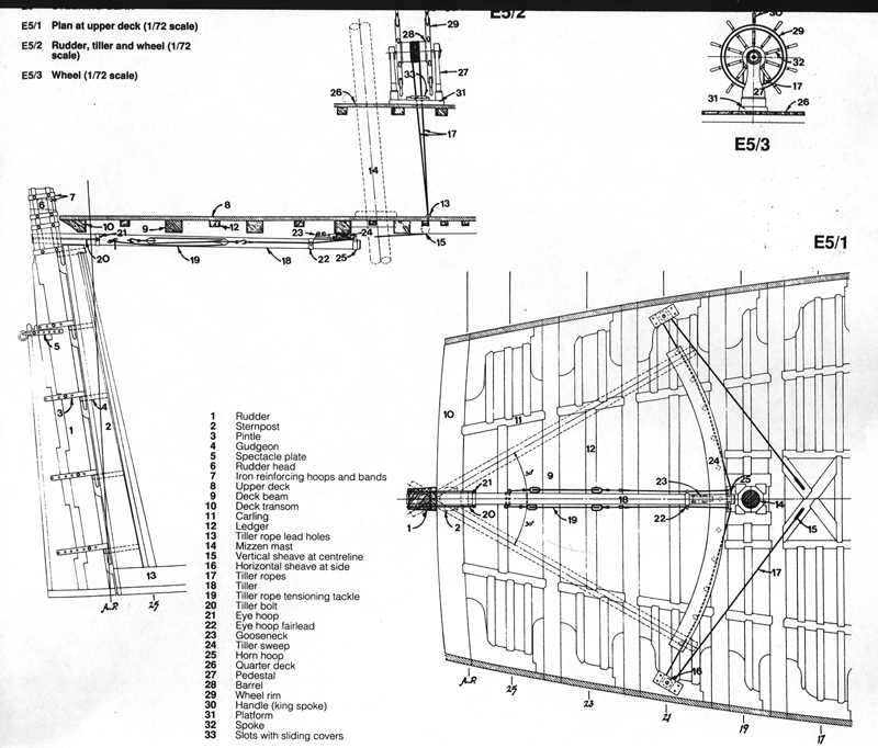 Przesłane przez Ciebie proponowane rozwiązanie jest dosyć zrozumiałe. Problem jest jednak w tym, że ja buduję model na postawie wycinanki shipyardu a tam są same uproszczenia. Jeżeli chodzi o zamontowanie rumpla pod dolnym pokładem, to nie ma takiej możliwości, bo musiałbym wtedy rumpel zamontować na wysokości ostatniego zawiasu pióra steru, a to nie wchodzi w grę. Istnieje jeszcze możliwość, (tak mi się przynajmniej wydaje) przedłużenia pióra steru w jego górnej części i zamontowanie rumpla pod górnym pokładem, a konkretnie pod sufitem (jeśli tak mogę nazwać) kabiny kapitana. Następnie za pomocą odpowiedniego zestawu bloczków wyprowadzić linki nad górny pokład i połączyć z kołem sterowym. Podpatrzyłem to w relacji oksala z budowy Endevaoura z 2010 roku. I tu wystąpi następna trudność - odległość. Bowiem koło sterowe usadowione jest za bezanmasztem, tak mniej więcej na wysokości drugiej furty działowej dolnego pokładu licząc od strony rufy. Natomiast długość rumpla ograniczona jest przez ściankę kabiny kapitańskiej, a tam już nic nie wykroję. Teraz zapewne zaraz posypią się na mnie gromy, że jest to niezgodne z rzeczywistością, a ja coś bezmyślnie improwizuję.