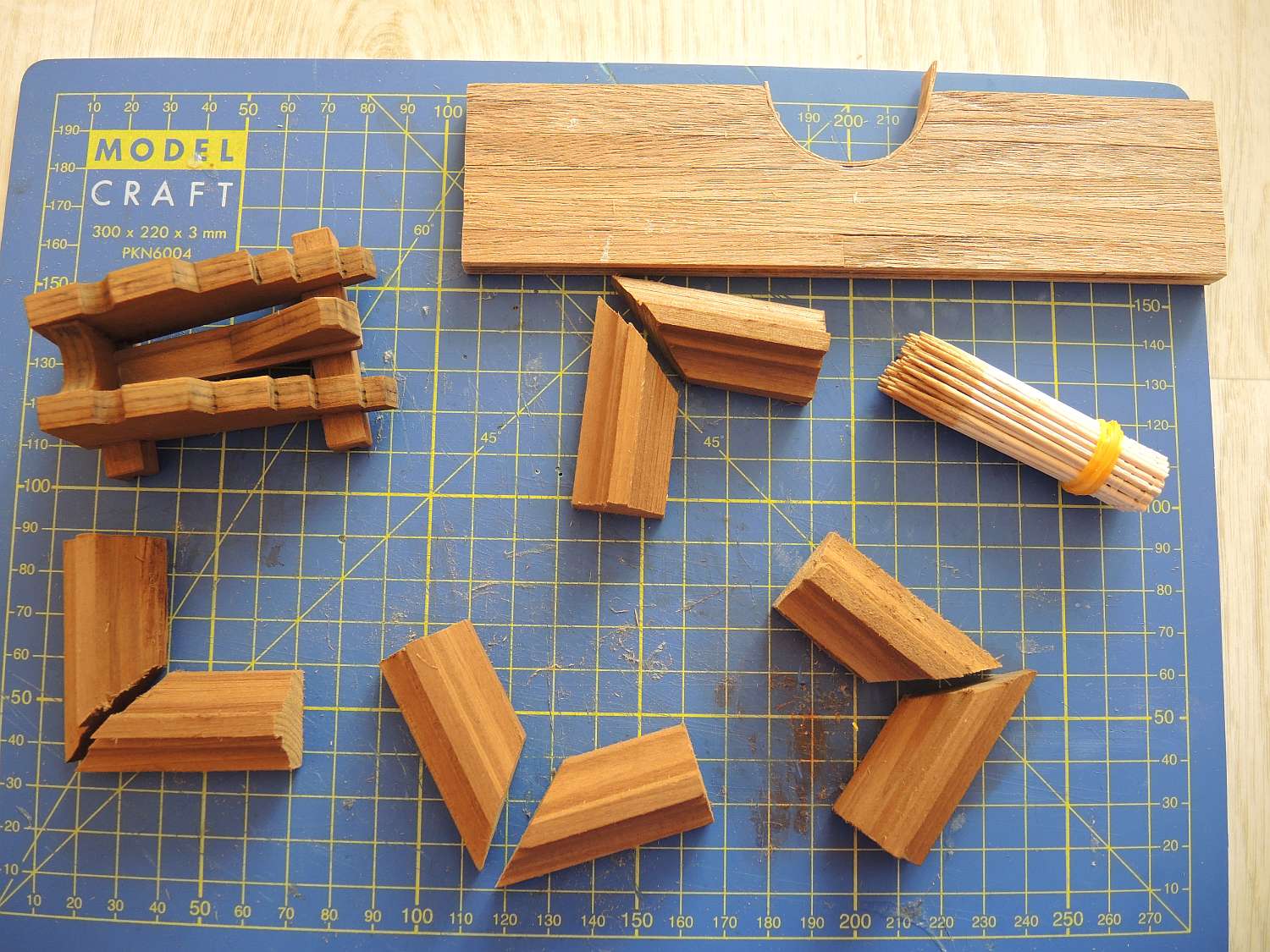 Załączone listewki w większości 1x8 mm do pokrycia pokładu i fragmentu <br />burty (ich jakość koszmarna co widać już po samych końcówkach)