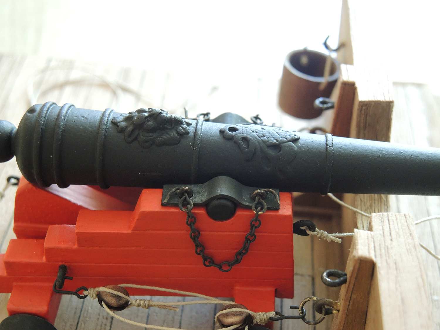 na fotce linki chyba nie są przełożone do końca .Na fotce zaznaczyłem jak dalej powinny przebiegać-w przeciwnym razie załoga powinna stać przy burcie lub po bokach(brak miejsca) Talia do bloczka przymocowana nie w tym miejscu a zaznaczony bloczek podwójny zobacz jak to wygląda na fotce znalezionej w nacie