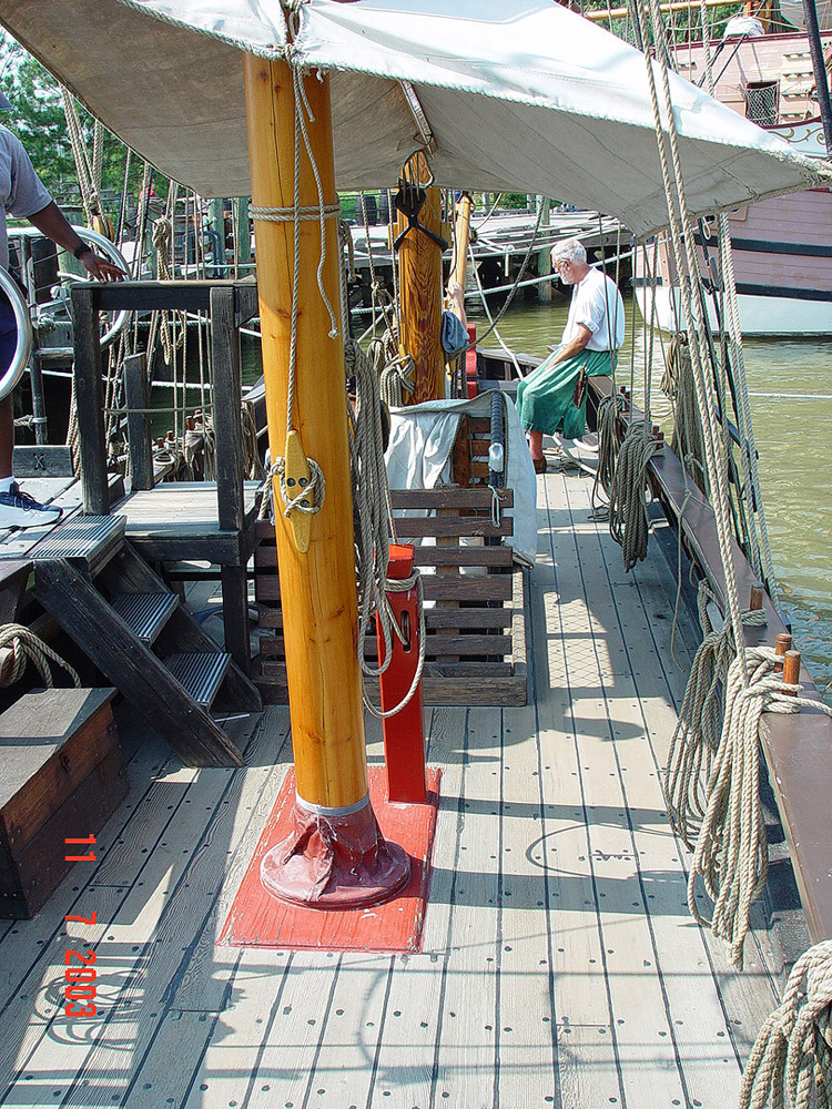 Zalaczam tez fotke repliki innej jednostki - "Discovery" - jednego z zaglowcow, ktorym przyplyneli z Europy pierwsi osadnicy do miejsca zwanego Jamestown w obecnej Virginii, w roku 1607, a wiec z gora 100 lat pozniej od Kolumba. Niemniej, wtedy wszelkie zmiany nie postepowaly az tak szybko, szczegolnie deskowanie pokladow. Z czasem skracaly sie tylko dlugosci poszczegolnych desek wraz z postepujacym wyczerpywaniem materialu. Na zdjeciu tez widac, ze ow "shift" nie byl az tak regularny, jak to w teorii sie proponuje. Zwroc tez uwage na kolor pokladu - rezultat chodzenia po nim, regularnego szorowania go i wplywu slonca oraz wody morskiej.